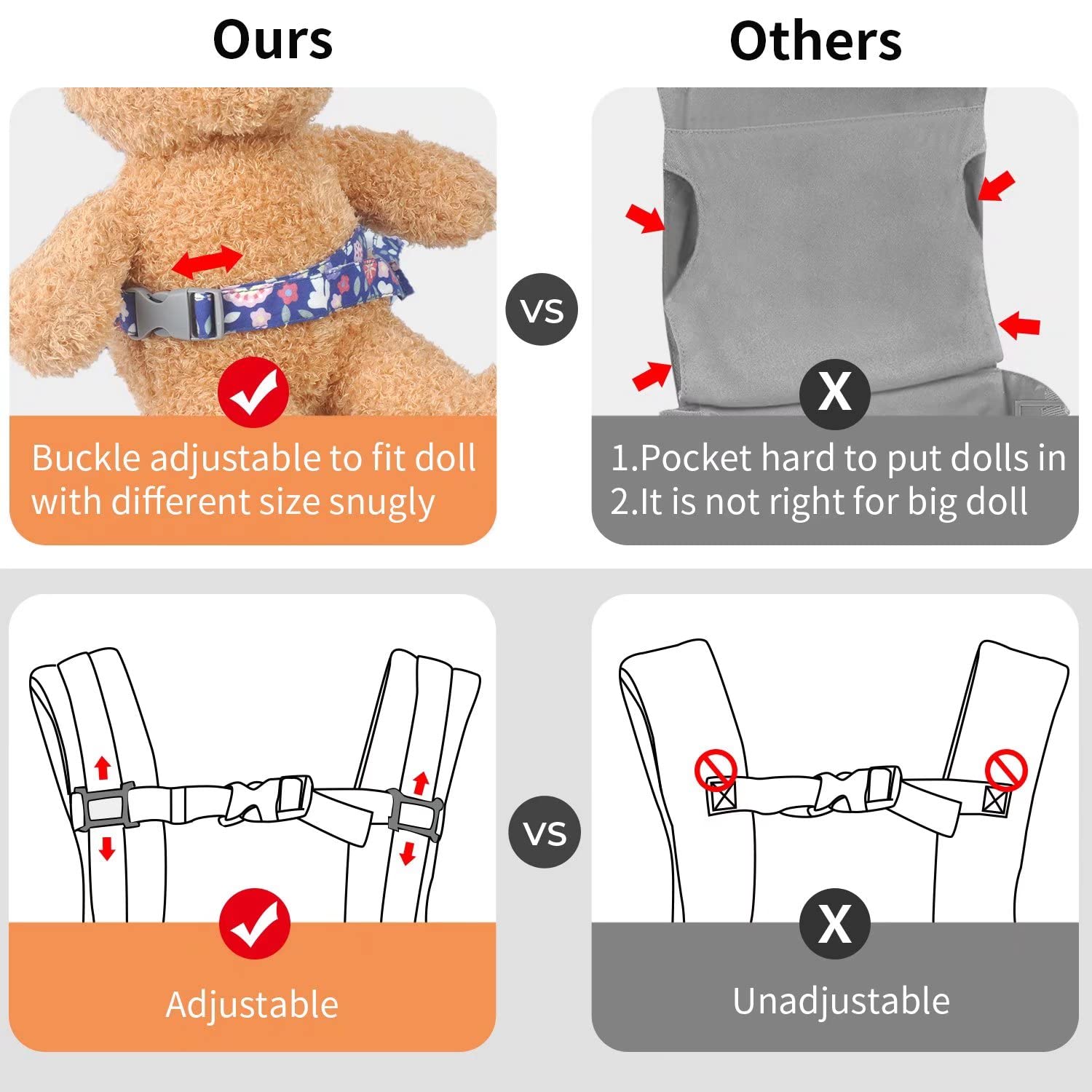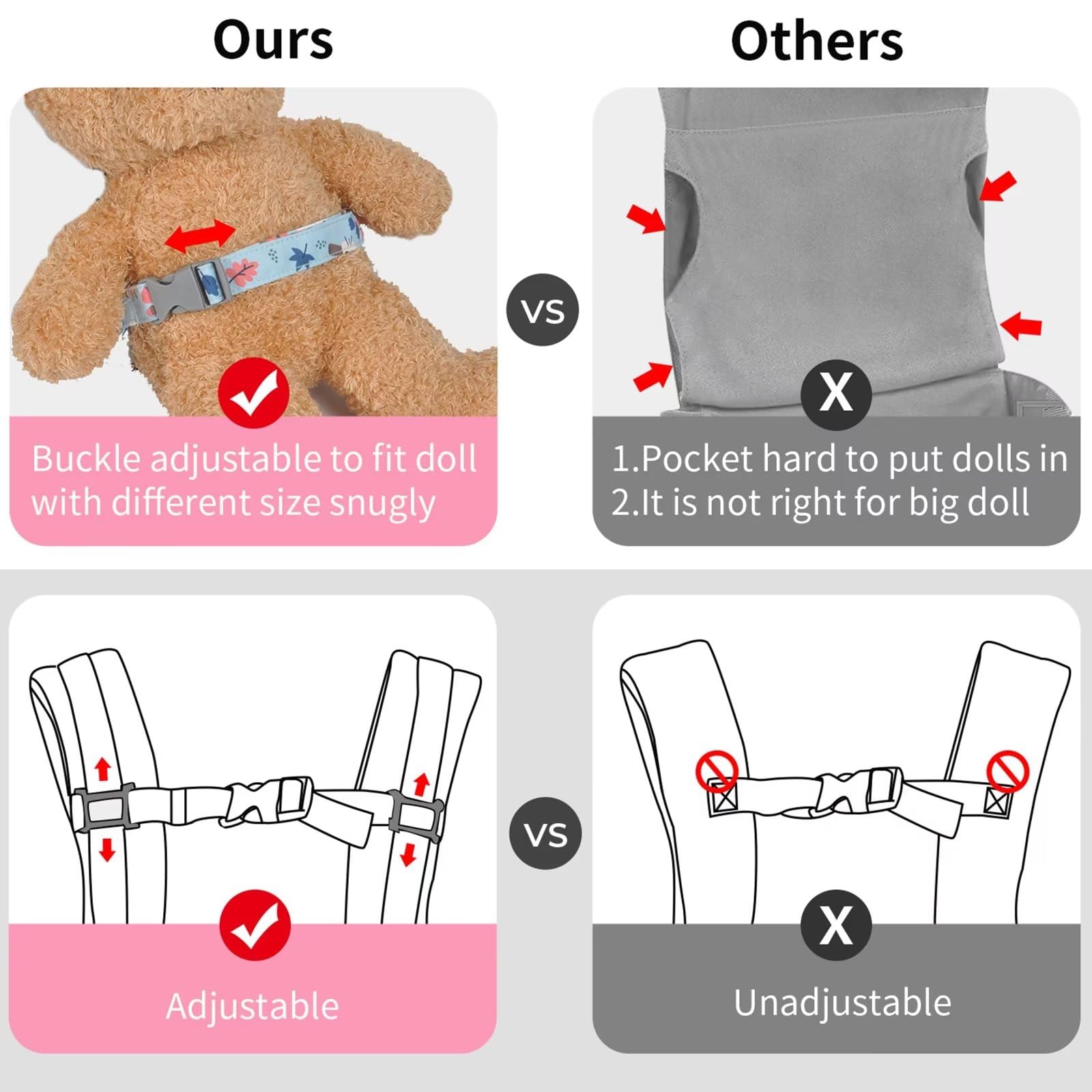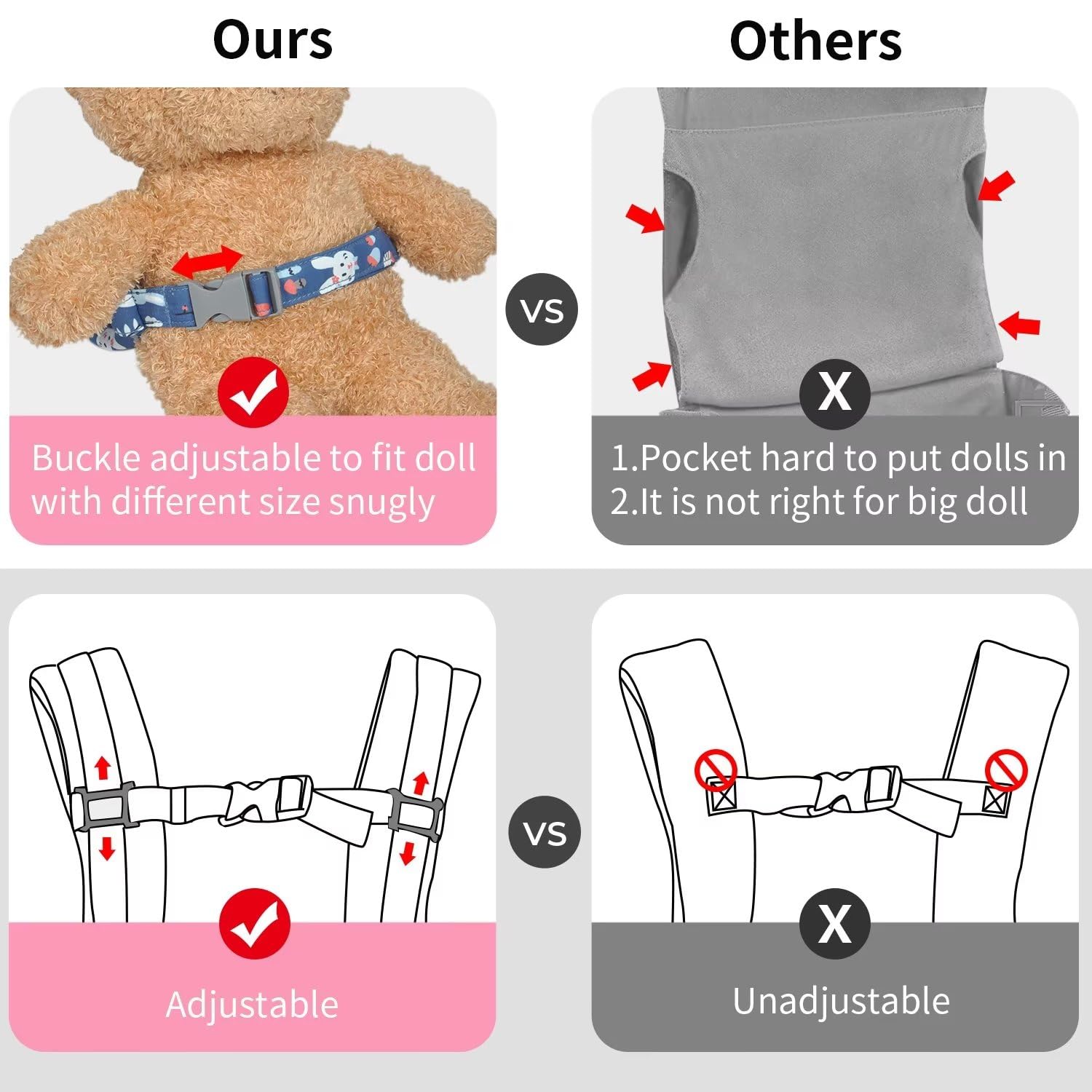 - [ Fit dolls snugly ] The baby doll carrier is with adjustable straps in the middle of the body. It can hold dolls or stuffed animals with different size snugly. And ensure that they will not fall down while kids running or jumping.
