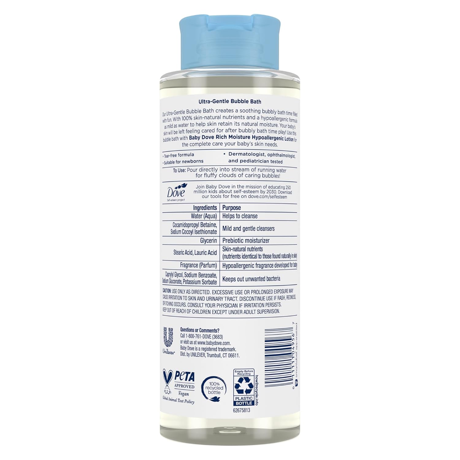 - CARE THAT GOES FURTHER: Every Baby Dove Bubble Bath is packaged in a 100% recycled bottle, and Baby Dove is PETA approved, meaning we do not test on animals anywhere in the world.