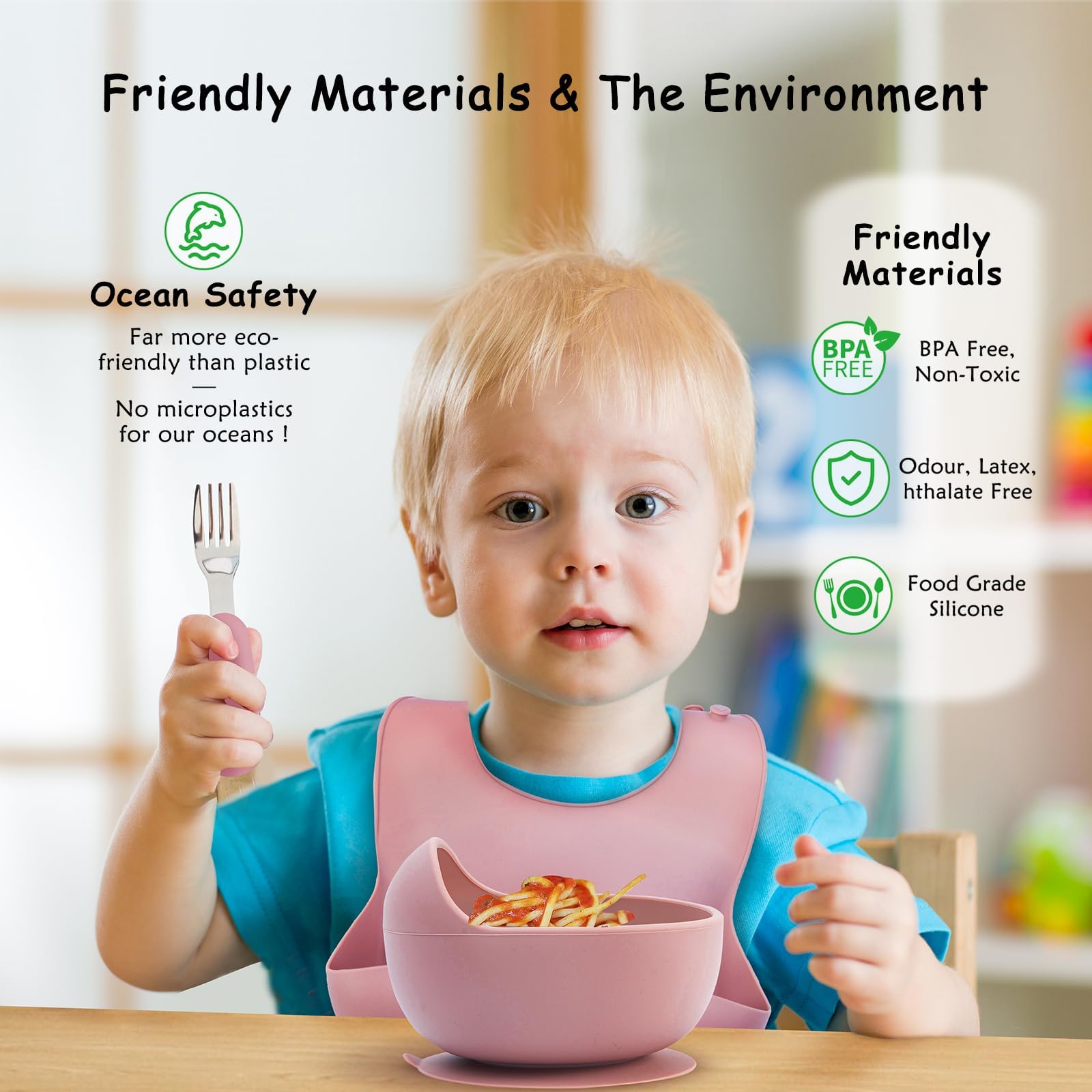 - šć100% Health-safe Food-grade SiliconećDear Parents! We understand your concern for your little baby's health. Thatās why we have designed this healthy and safe silicone baby feeding set. The baby cutlery set is phthalates/PVC/lead/BPA free and does't contain harmful chemicals. You can safely let your baby use it!