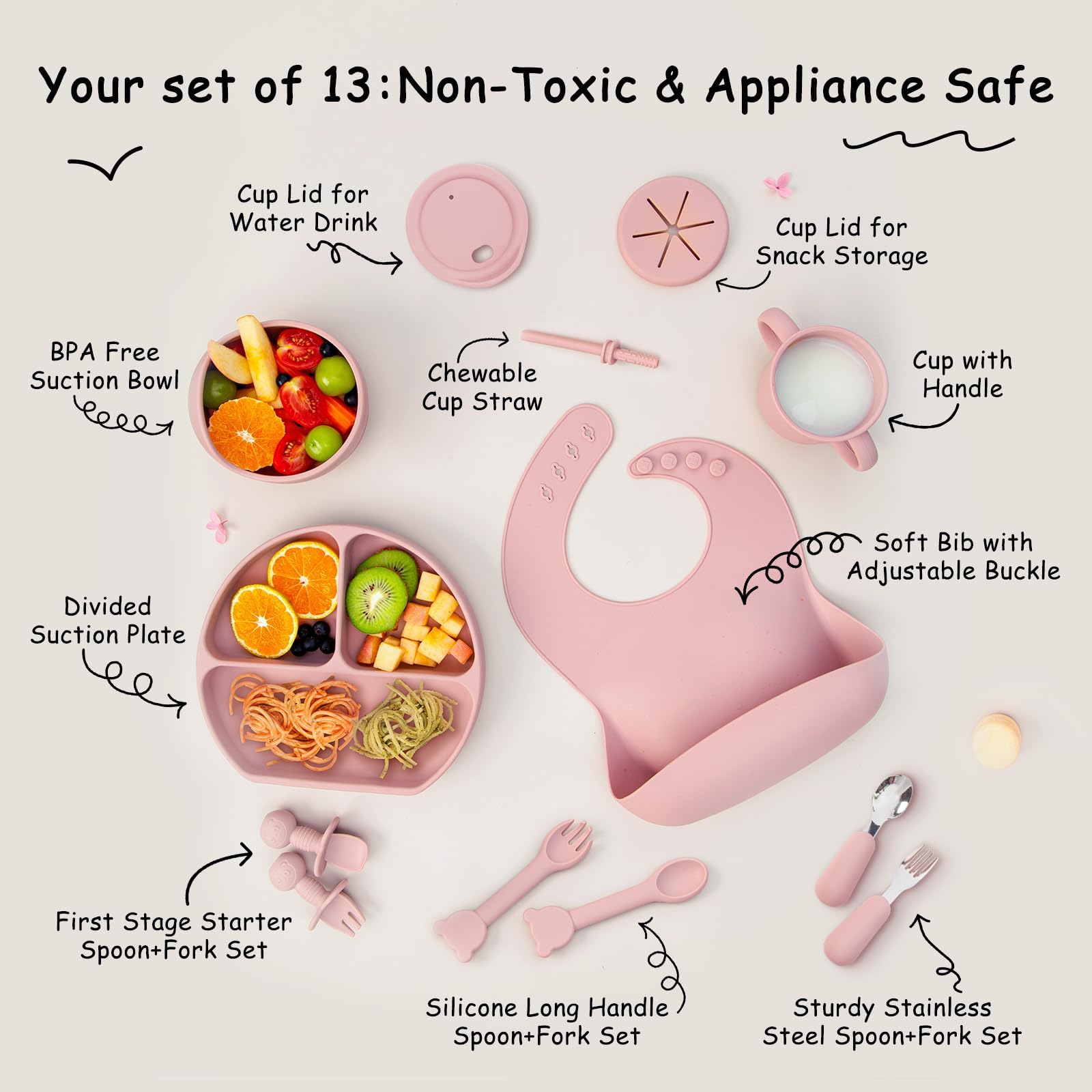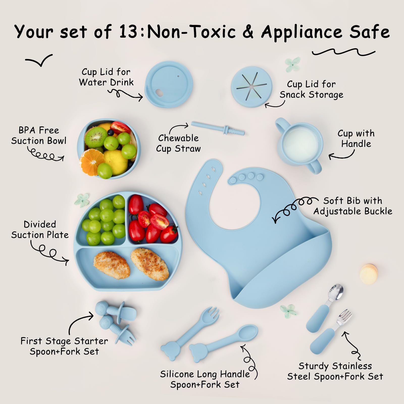 - š„£ć13 pcs Set Contains Everything Your Baby NeedsćThis Silicone baby feeding set contains a 4-compartment suction plate, suction bowl, straw sippy cup with 2 lids, adjustable weaning bib, and 3 sets of fork and spoon for different stages. This silicone baby feeding set has everything your baby needs to eat independently.