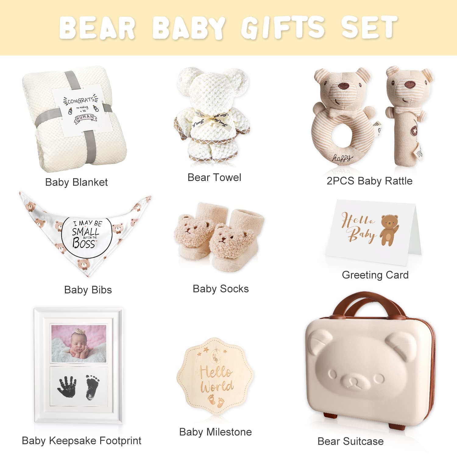 Baby Gift Set, Baby Shower Gifts for Girls Boys, Bear New Baby Gift Basket Include Newborn Rattle Blanket Wooden Keepsake Milestone Cute Bibs Socks Greeting Card, Baby Gift Essentials Stuff