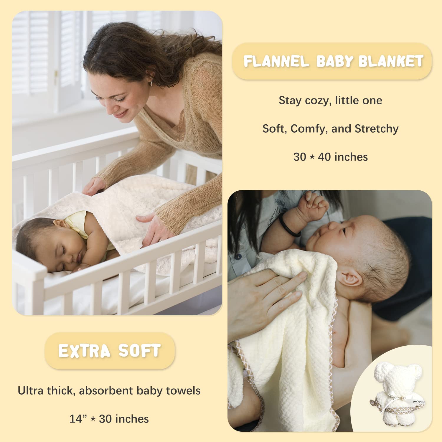 - 【FUN BABY SHOWER GIFTS】The best gifts for babies stimulate their senses. Gentle rattle noise is perfect sensory stimulation for infants, this cute bear rattle is sure to be baby's favorite shake toy. Baby snuggle blankets keep babies feeling as secure as they are in mom's arms, the soft and fluffy feel makes baby feel relaxed and warm. Baby towel packed in bear shape, super soft coral fleece material, the water absorption is particularly good, it will not harm the skin during use
