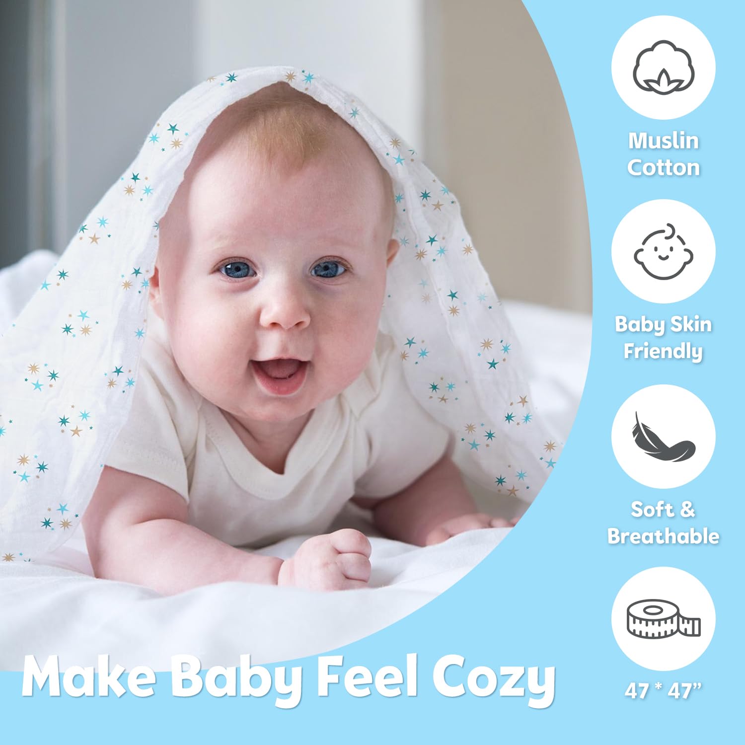 - 【THOUGHTFUL AND PRACTICAL BABY GIFTS】Swaddling will keep babies feel cozy and tight, reminding them of the familiar place in their mama's belly. It’s a great way to soothe and comfort a baby, giving them the feeling of being held nice and snug. The 47” x 47” swaddle allows you to easily swaddle any size newborn baby, and it doubles as a stroller cover, shawl, scarf, nursing cover, and changing pad as your child grows