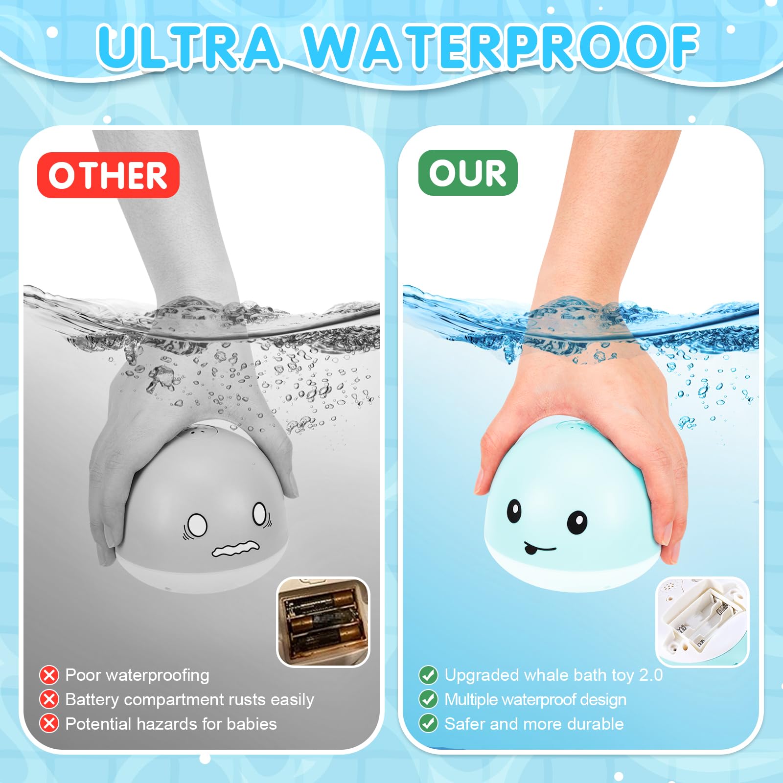 - Upgraded Whale Bath Toy Sprinkler: We understand your concerns about water damage and the toy not lasting long enough. But don't worry! We've made some awesome upgrades to address those issues. The whale bath toy now has multiple waterproof designs in Sealed Motor, Isolation-protected Circuit Boards, and Waterproof Rubber Ring. Tips: The battery cover needs to be screwed on tightly to utilize the waterproof function of the waterproof ring