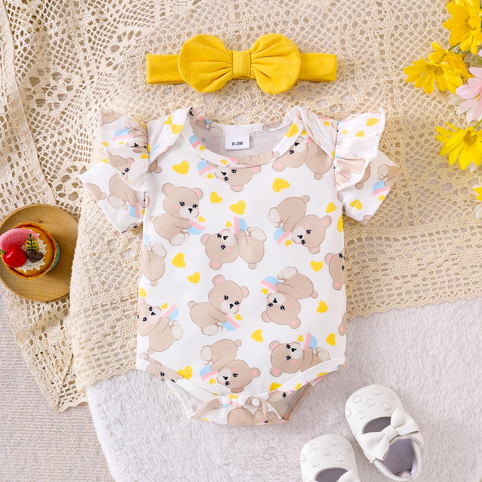 - Unique Design: The romper showcases cute ruffle details on both shoulders, adding a touch of elegance. The suspender skirt features an adorable bear print on the front, bringing playful charm. Paired with a stylish bow headband, this set makes your baby girl stand out in any crowd. The romper includes hidden snap buttons for quick and easy diaper changes. The adjustable straps on the suspender skirt and elastic waistband provide a customized fit as your baby grows.