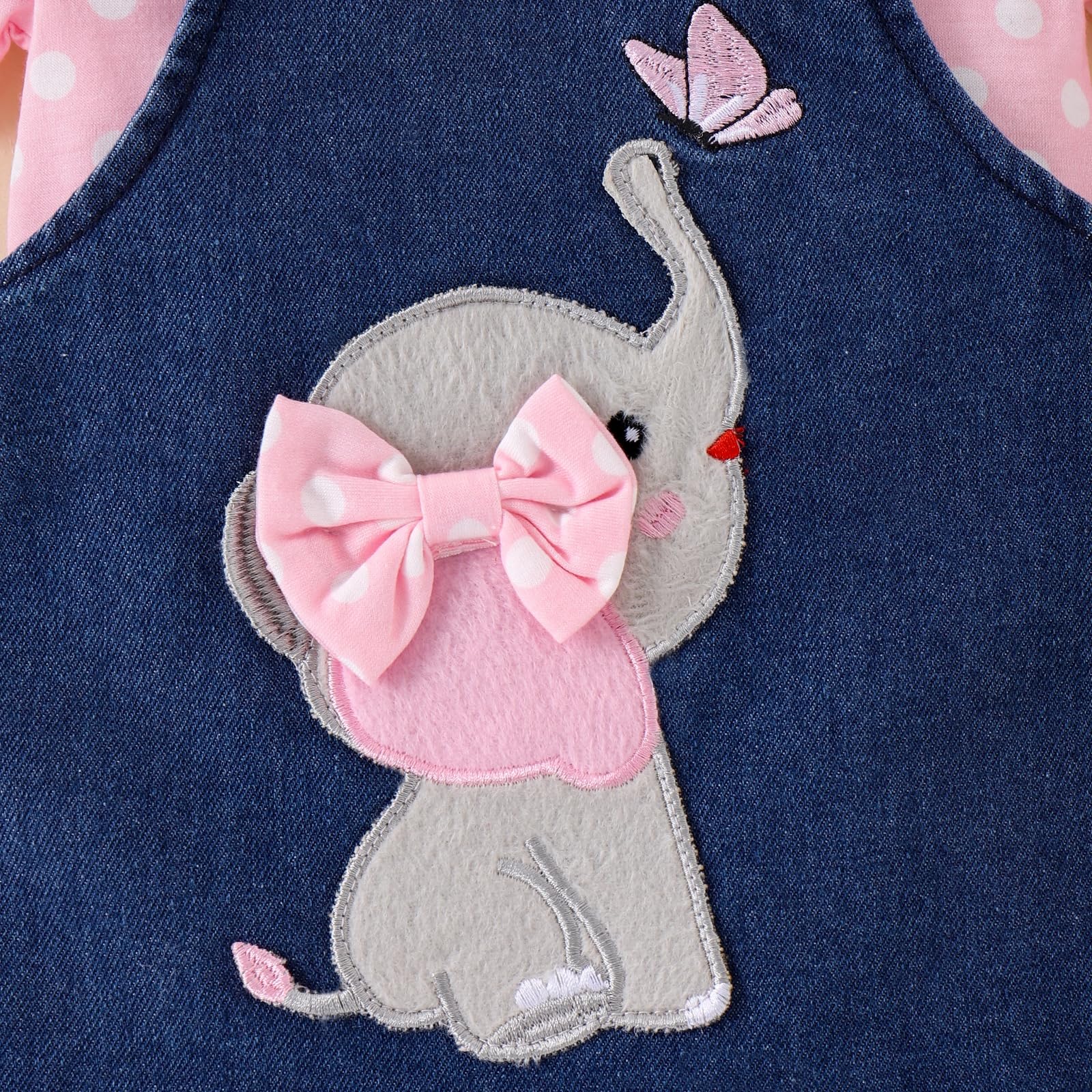 The design features playful polka dot ruffle shoulders and a denim suspender skirt adorned with cute cartoon patterns, such as an elephant and butterflies, adding a fun, whimsical touch. The carefully designed snap buttons make it easy to dress and change diapers, while the adjustable buttons on the suspender skirt allow for length customization to accommodate your baby’s growth, ensuring a comfortable fit.