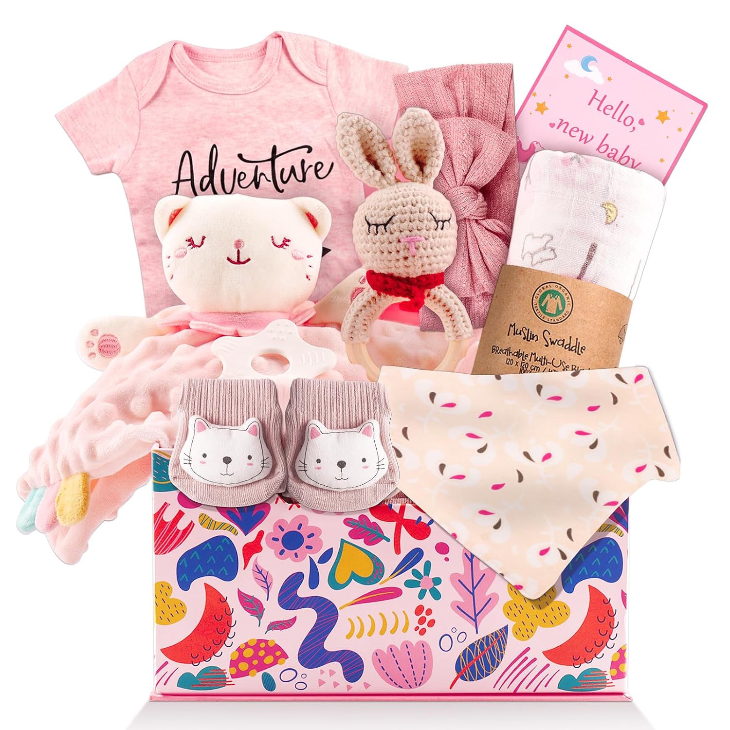 - UNIQUE BABY GIRL GIFTS:9-piece pink set, including bunny rattle*1, lovey cat soothing towel*1, 47 * 47 inch baby blanket*1, cat non slip socks*1, baby bib*1, pink baby suit*1, pink headband*1, welcome card*1, gift box*1