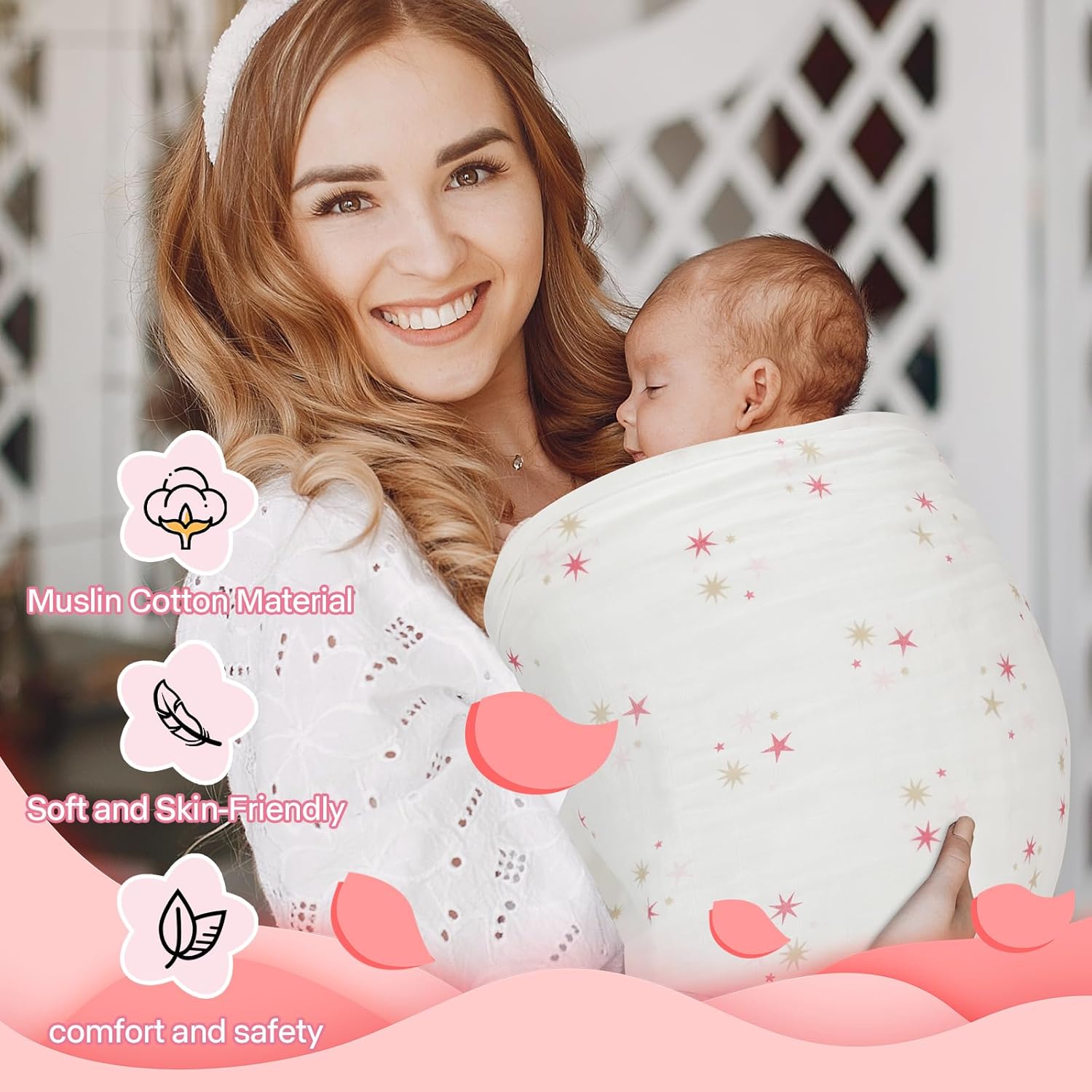- Muslin Swaddle Blanket: Our Muslin Swaddle Blanket is made from 100% breathable muslin cotton, it provides a gentle, cozy feel that's perfect for sensitive skin. Versatile and generously sized, it's ideal for swaddling, nursing, or as a stroller cover. Pink-star print design, our blankets make a charming addition to any nursery or baby shower gift. Give your little one the softness they deserve with our Muslin Swaddle Blanket!