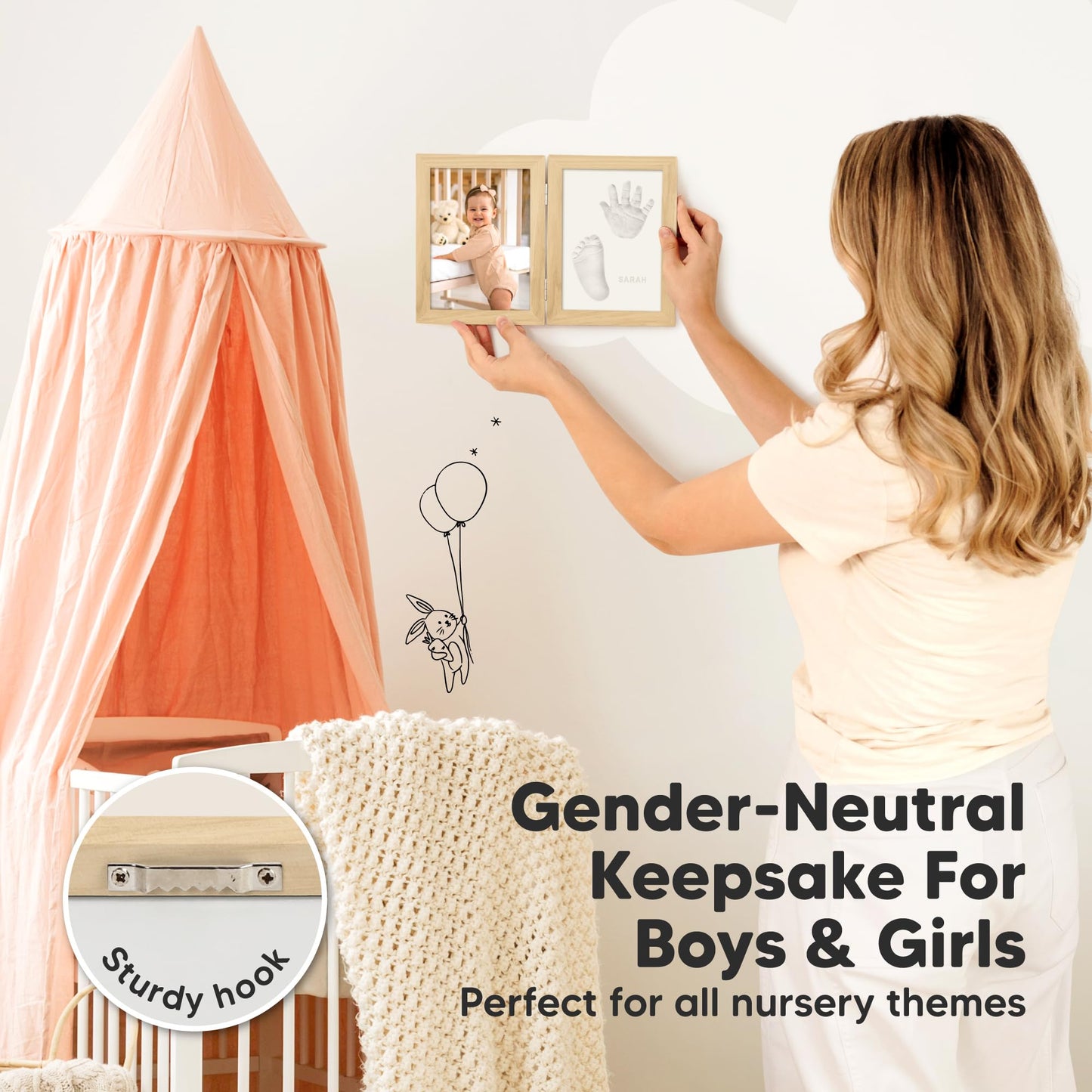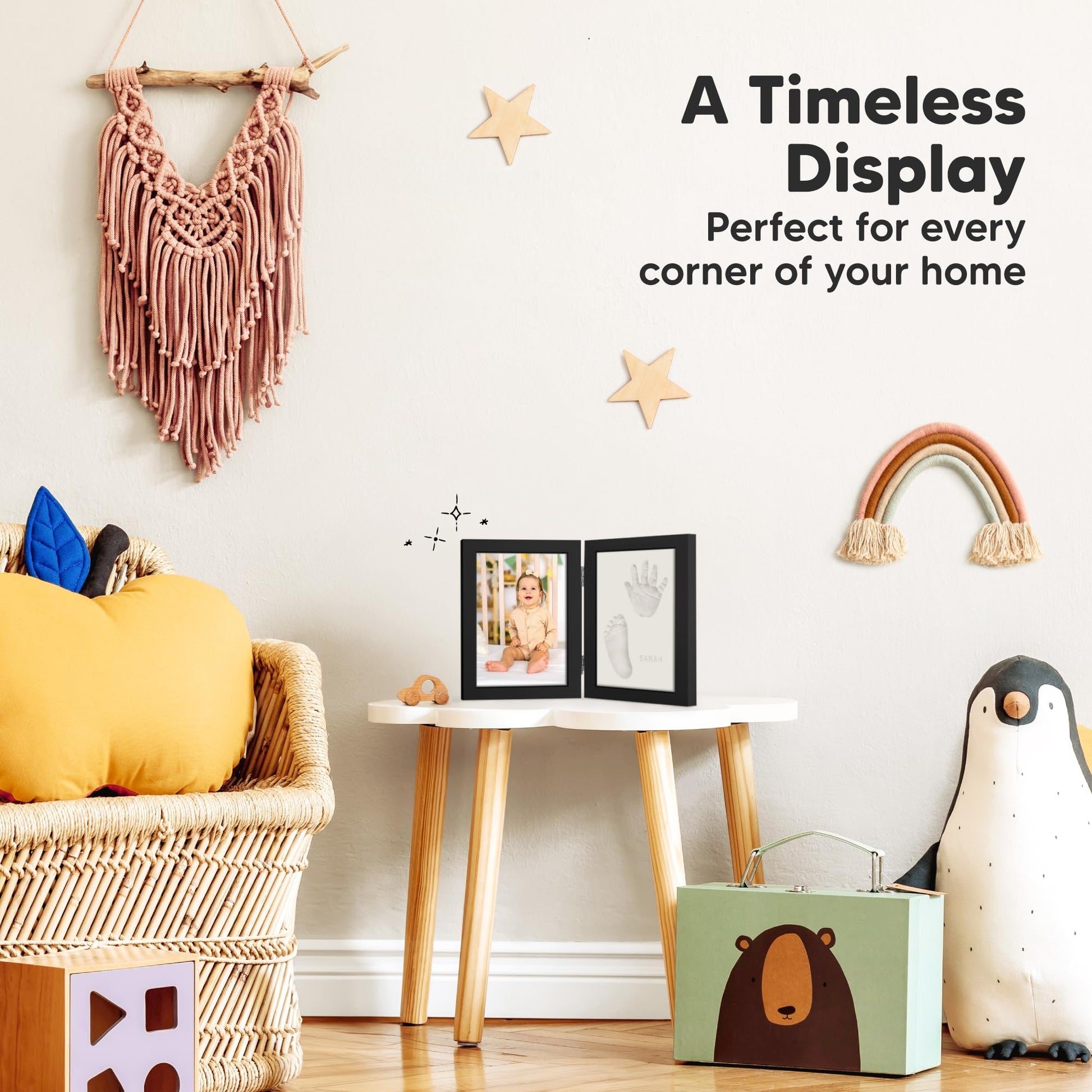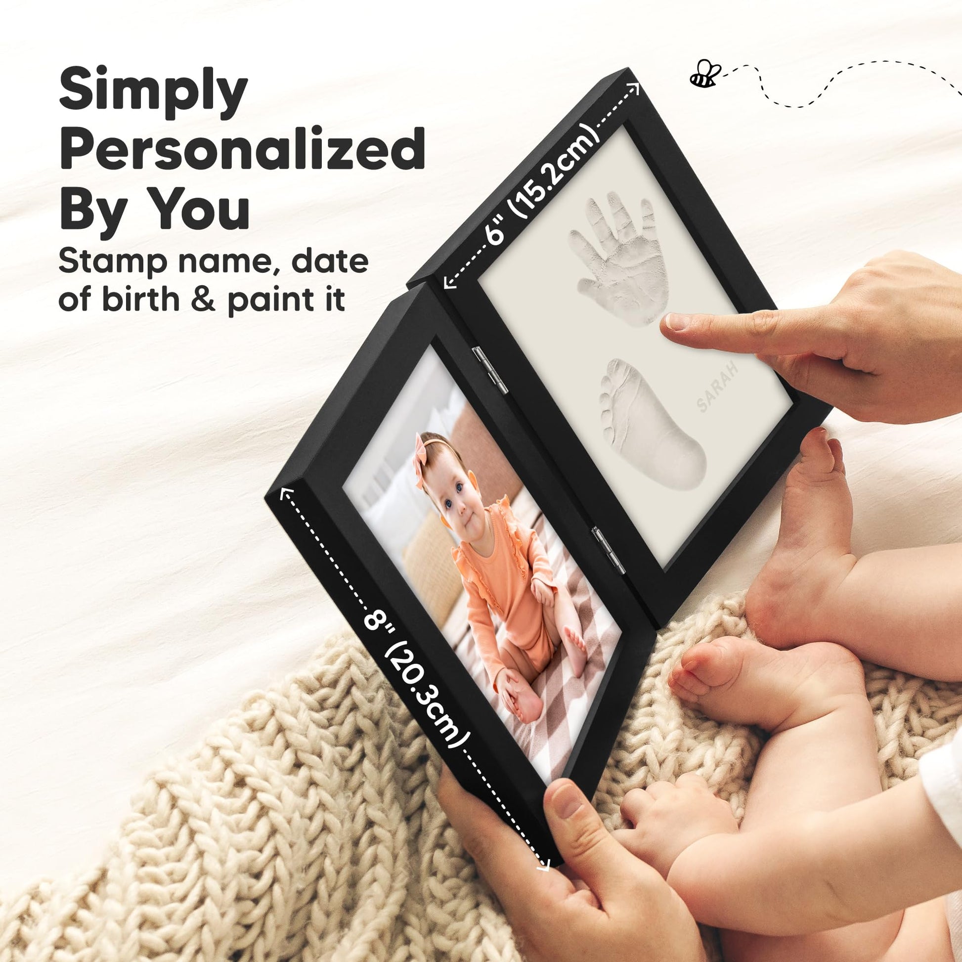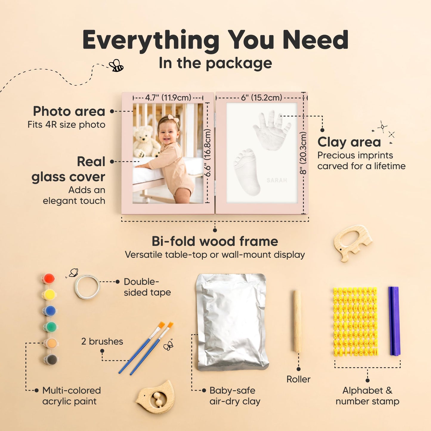 - All-in-one Baby Handprint and Footprint Kit - An elegant bi-fold Rune wooden frame with real glass cover, baby-safe air-dry clay, a wooden roller, alphabet stamps, paint and brush for personalization, and double-sided tape to keep it all in place.