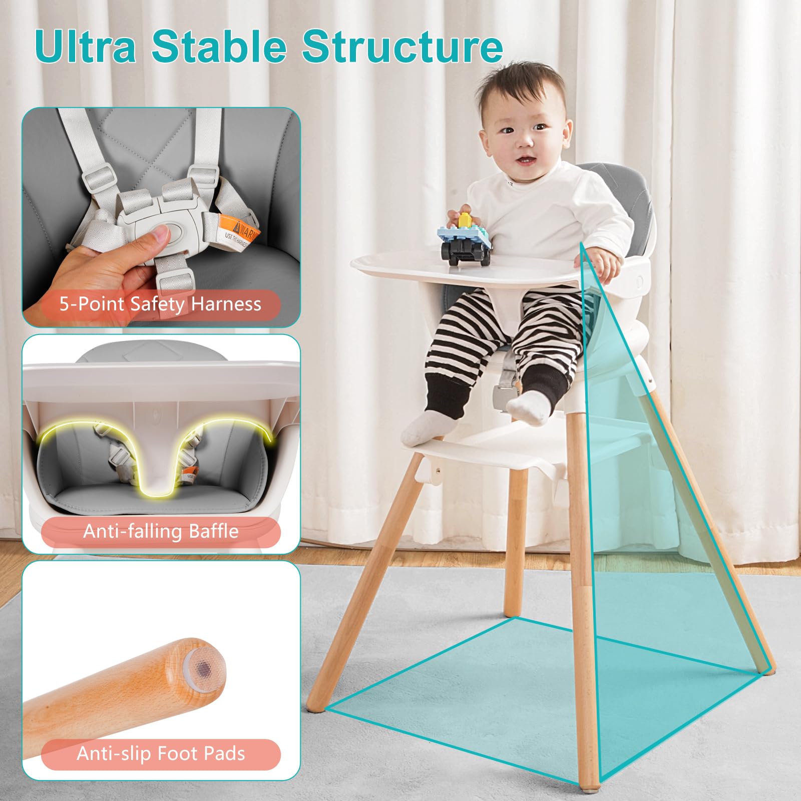 - 【Stable & Safe Design】Built in a stable pyramid structure, this convertible baby high chair is not easy to tip over. 4 sturdy legs are made of solid beech wood with anti-slip foot pads. Besides, there is a 5-point safety harness and an anti-falling baffle to protect your baby from sliding off from the chair.