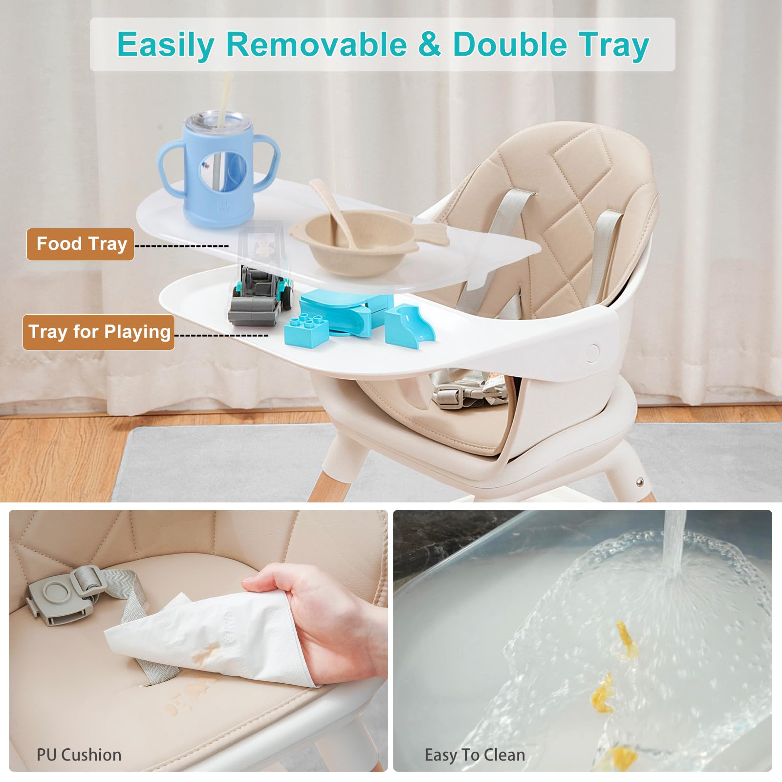 - 【Hassle-free Assembly & Cleaning】Combing with detailed instruction, this baby high chair is quick to assemble. The beech wood legs are easy to assemble and disassemble with built-in screws and nuts. Moreover, the smooth and waterproof PU leather cushion cover is easy to clean just with damp cloth.