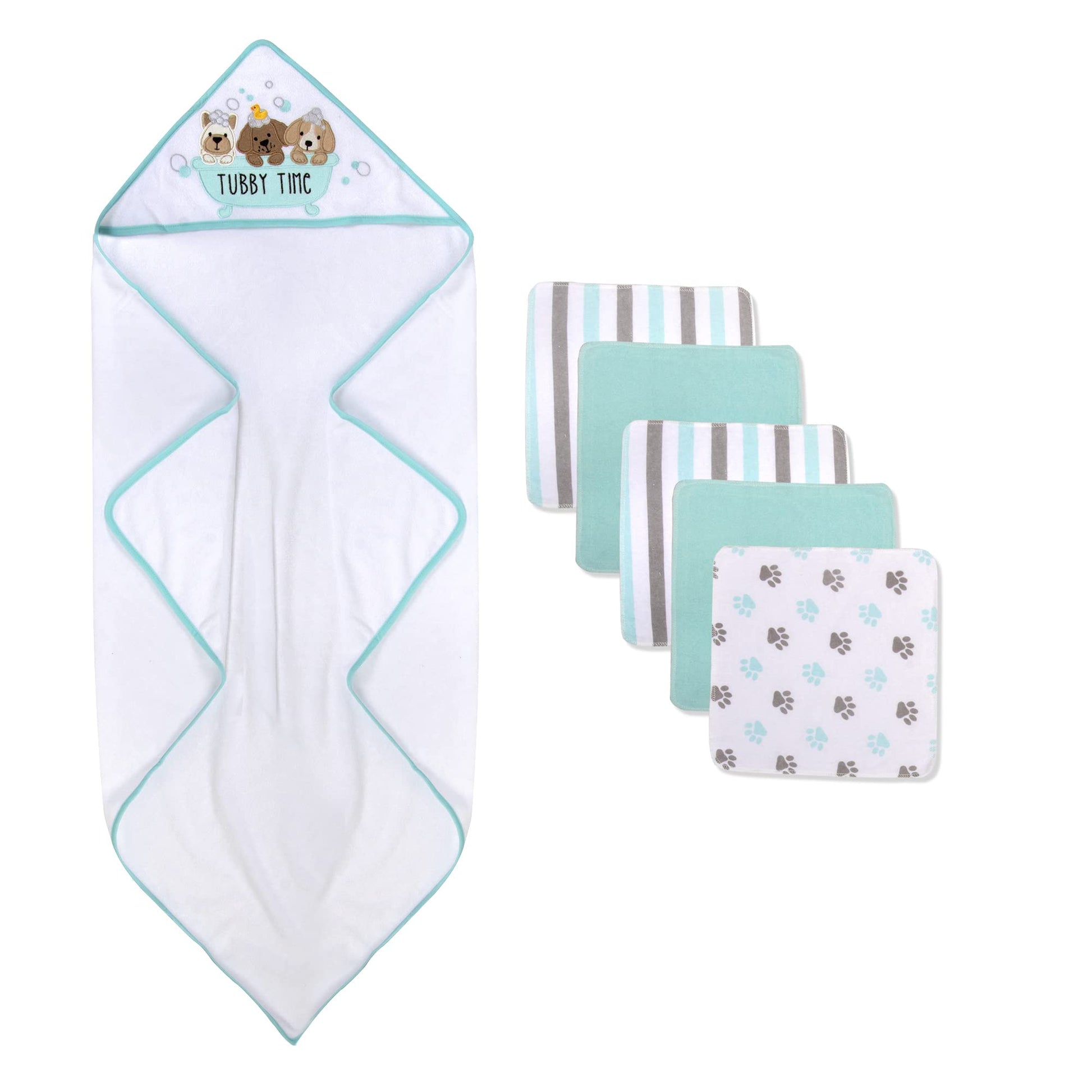 - BABY HOODED BATH TOWEL AND WASH CLOTHS SET: Each 6 piece baby set includes 1 cotton soft woven terry cotton towel and 5 matching wash cloths