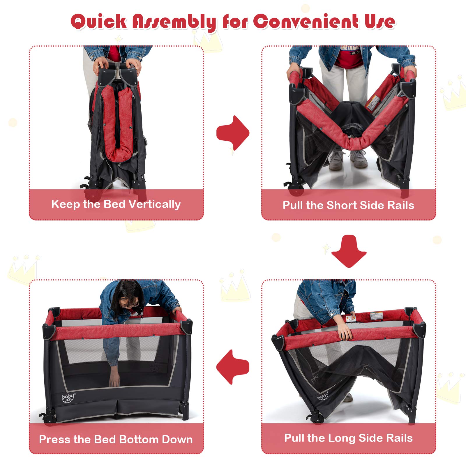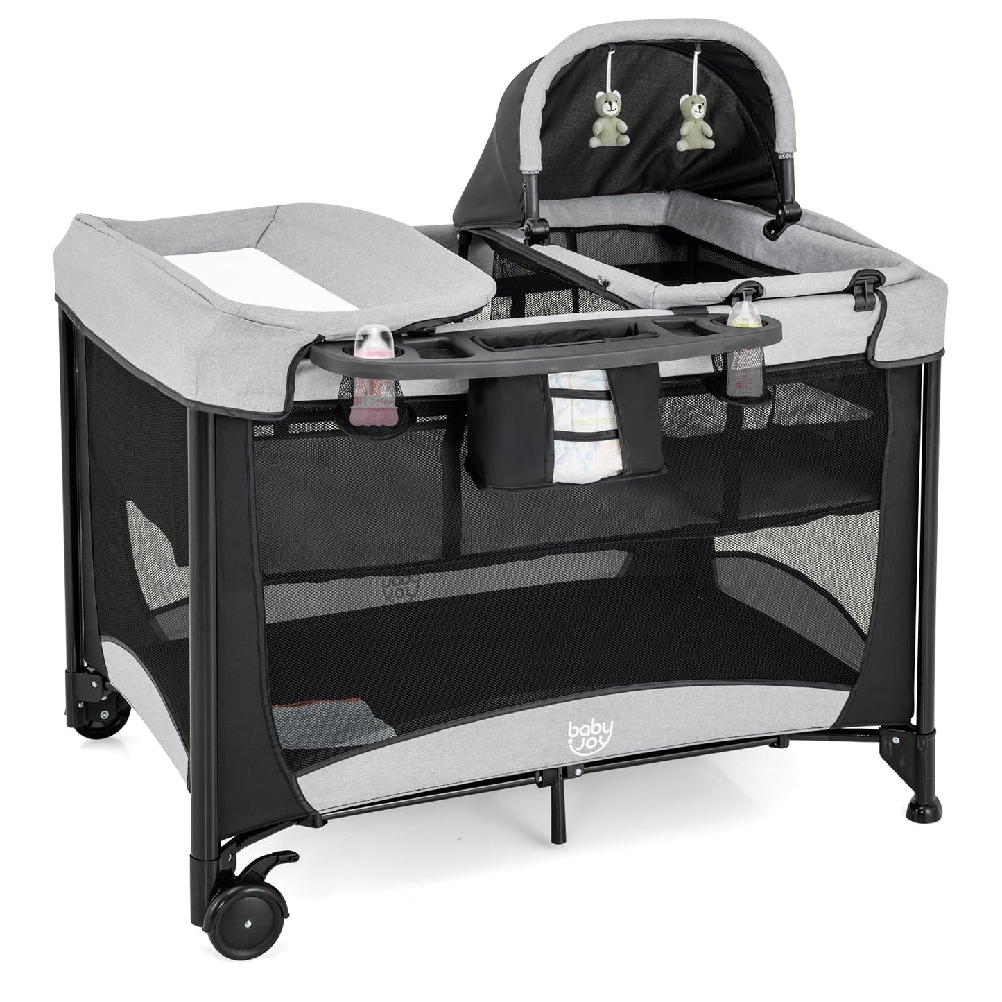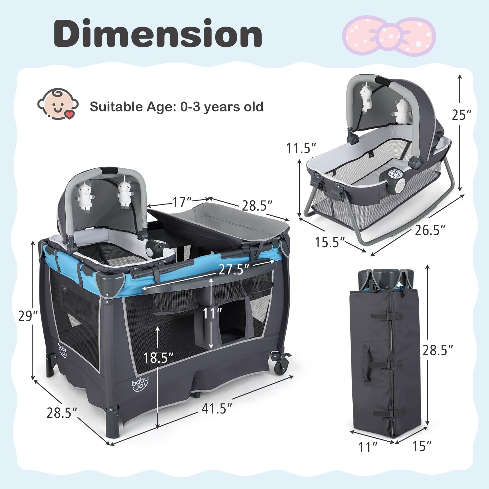 - 【All-in-one Pack and Play】 BABY JOY 5 in 1 pack 'n play accompanies the growth of your baby. The design of the diaper table allows the mother to easily change diapers, and the comfortable playard provides a place for the baby to rest. In addition, the soft mattress offers comfortable lying experience(Suitable Mattress Pad's Size: 38''x26''). Morever, the portable bassinet makes it more convenient for you to carry around.