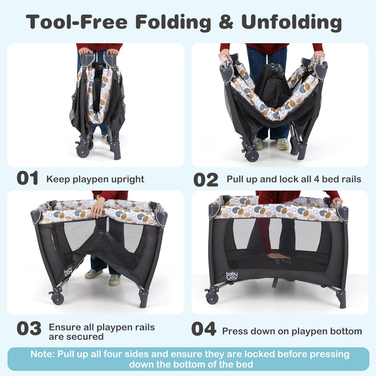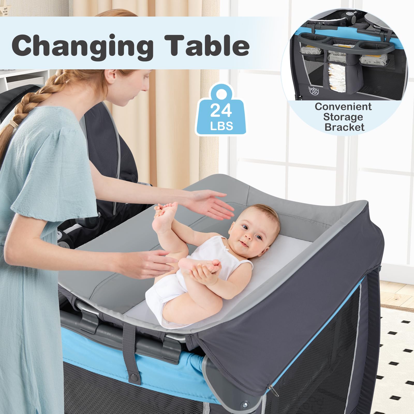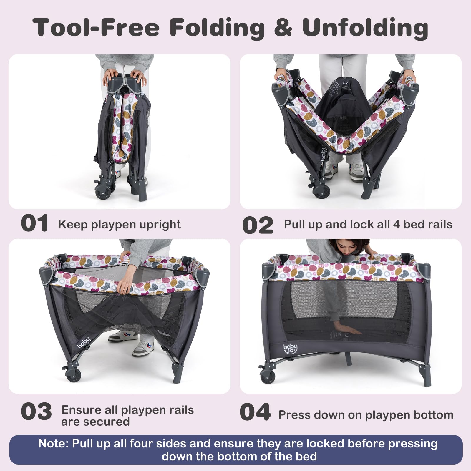 - 【All-in-one Pack and Play】 BABY JOY 5 in 1 pack 'n play accompanies the growth of your baby. The design of the diaper table allows the mother to easily change diapers, and the comfortable playard provides a place for the baby to rest. In addition, the soft mattress offers comfortable lying experience(Suitable Mattress Pad's Size: 38''x26''). Morever, the portable bassinet makes it more convenient for you to carry around.