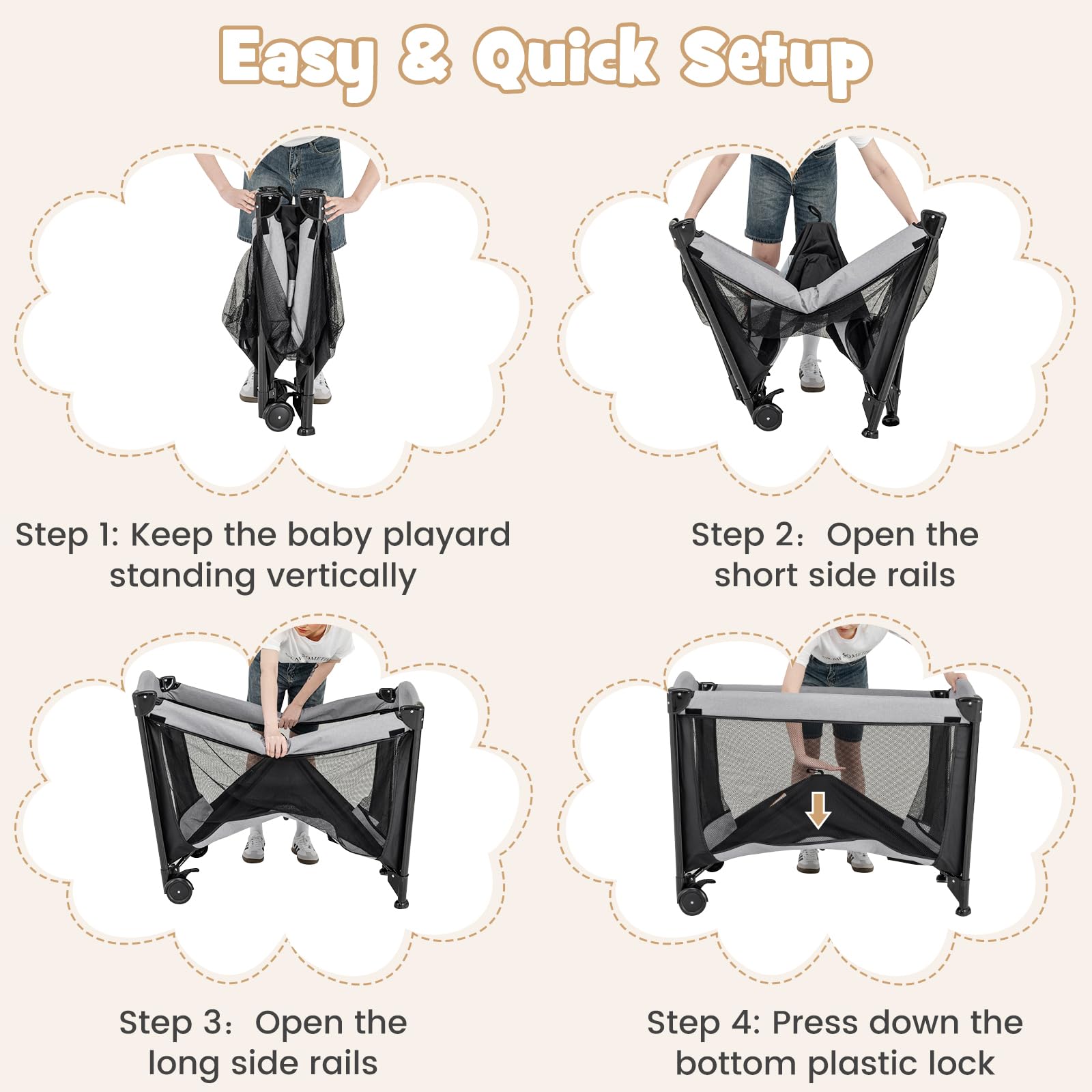 - 【Convenient & Flexible Babysitting】 There are two universal wheels with brakes at the bottom of the baby playard so that it can move flexibly. The mesh design provides a better visibility for parents to observe the baby at any time. In addition, the storage basket hanging on the side is convenient for storing various baby necessities.