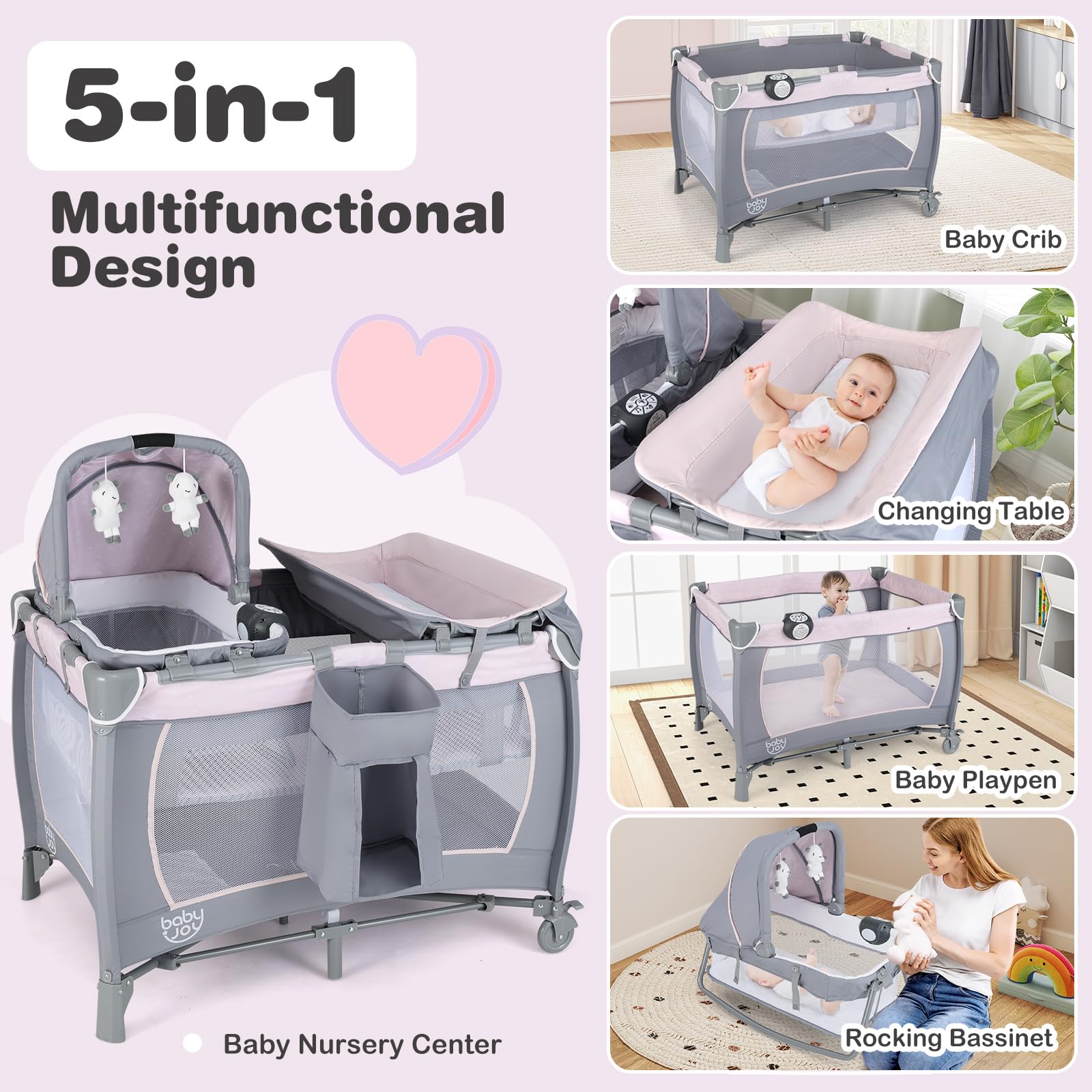 BABY JOY 5 in 1 Pack and Play, Portable Baby Playard w/Bassinet & Diaper Changing Table, Infant Pink Bassinet Crib with Toys & Music & Oxford Bag for Baby Girl Toddlers (Pink + Purple, Starry Sky)