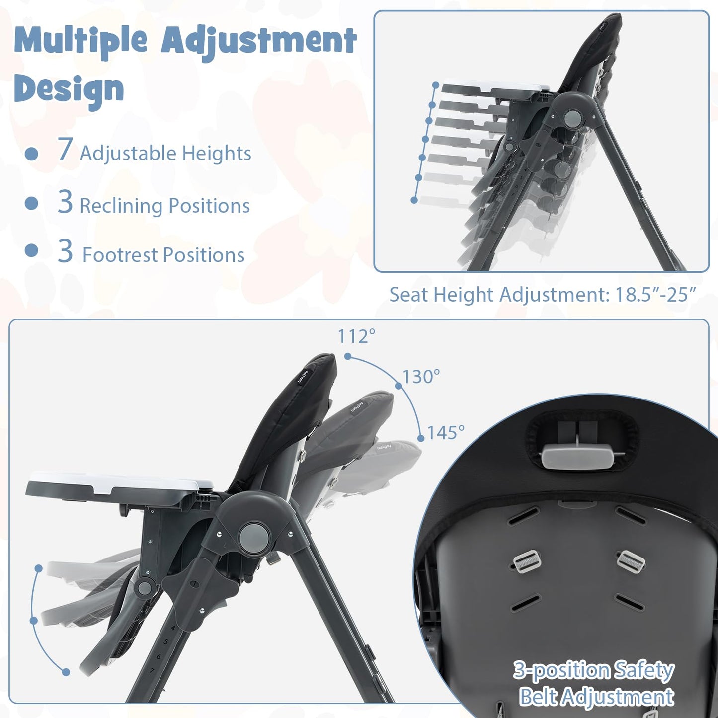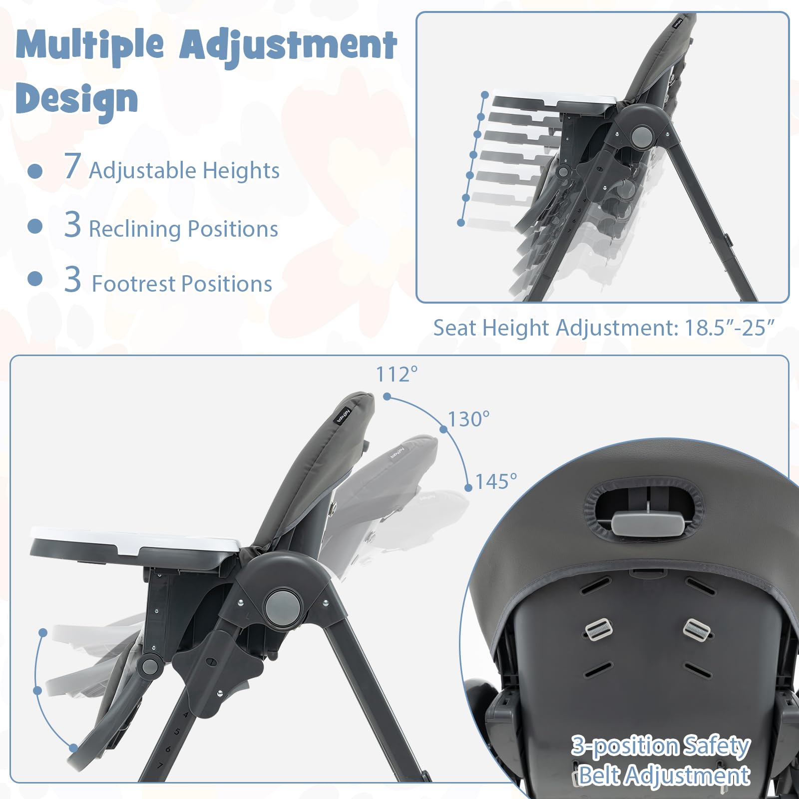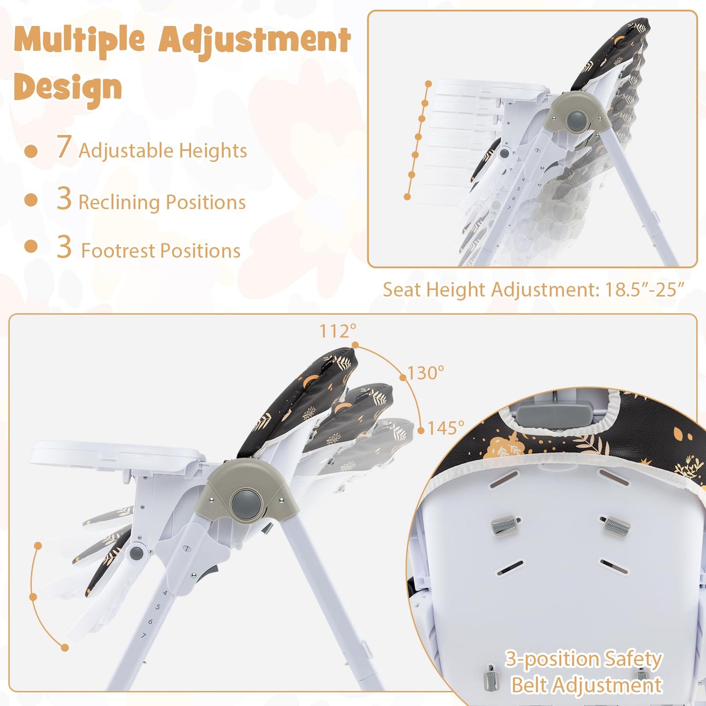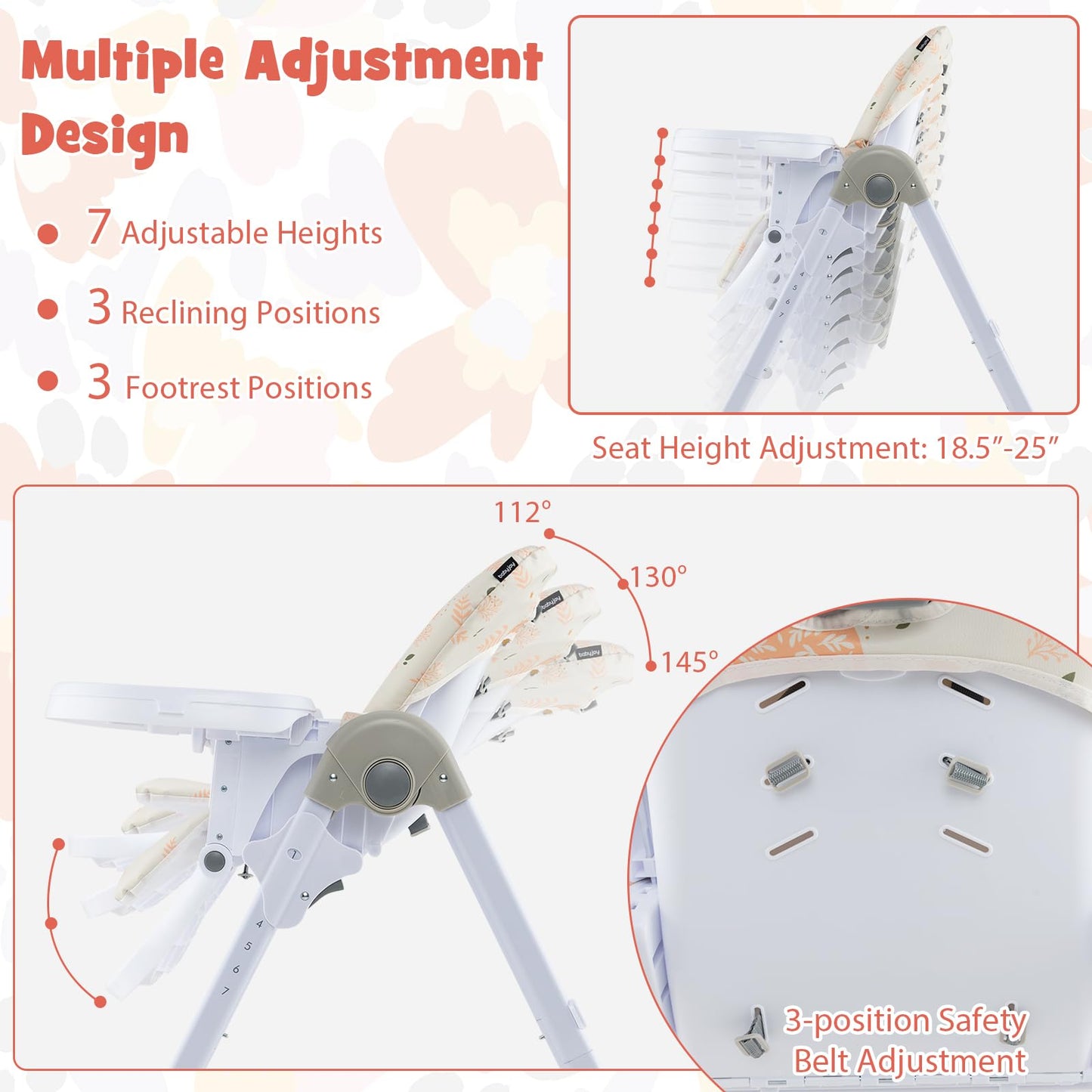 - Adjustable Heights & Backrest & Pedal: Our baby high chair features 7 adjustable heights with a wide pressing button for easy operation. Moreover, the backrest can be adjusted in 3 levels from sitting to lying position. Foot pedal also features with 3 positions coinciding with backrest for different needs.