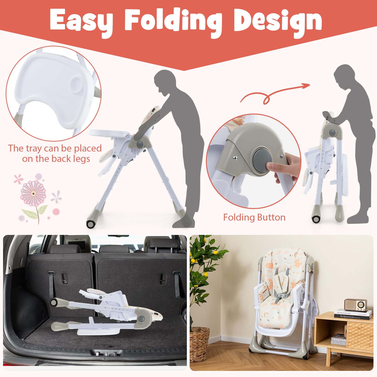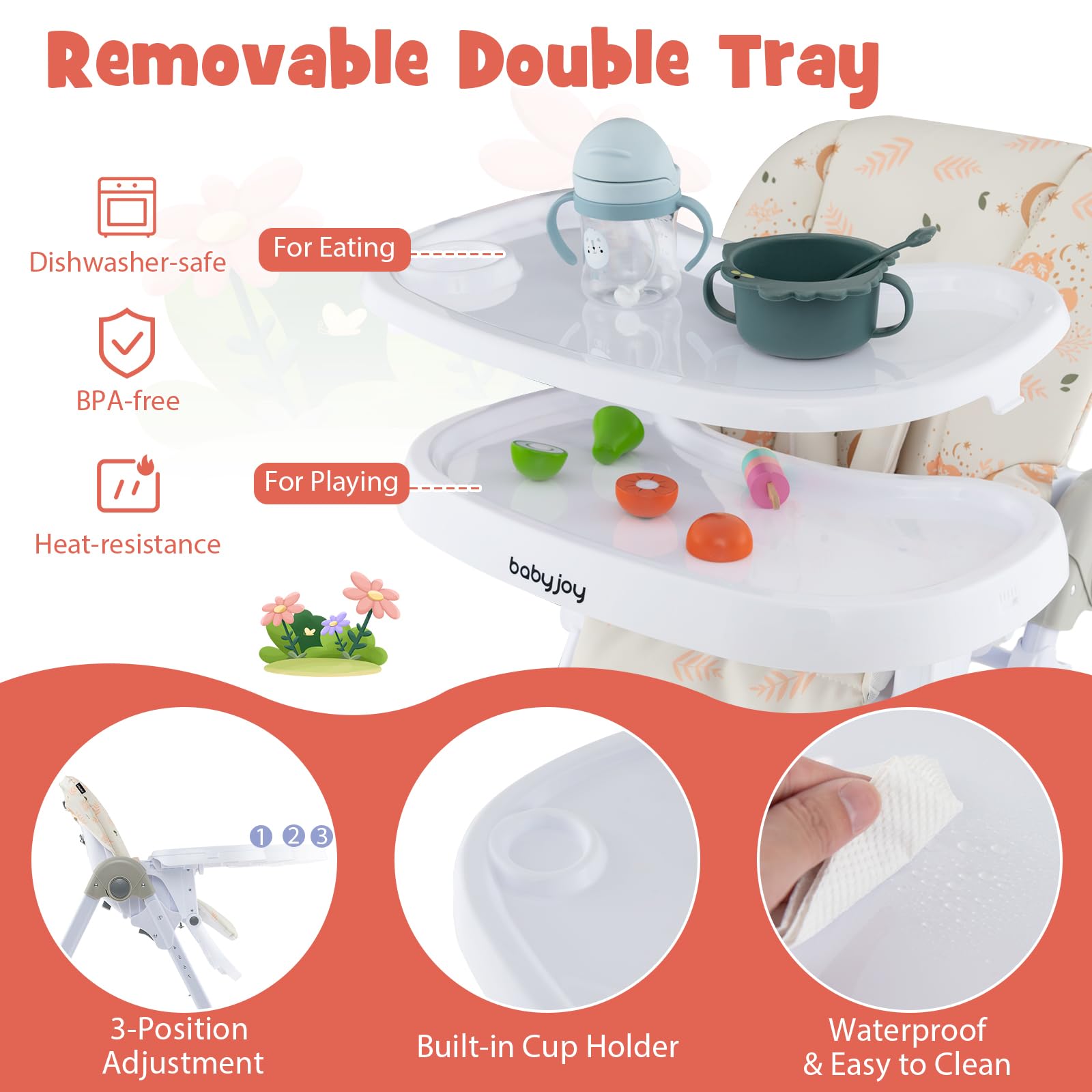 BABY JOY Convertible High Chair for Babies & Toddlers, Height Adjustable, Grow & Go High Chair w/Recline & Footrest, Removable Double Tray, Portable Baby Dinning Chair with Wheels (Beige)
