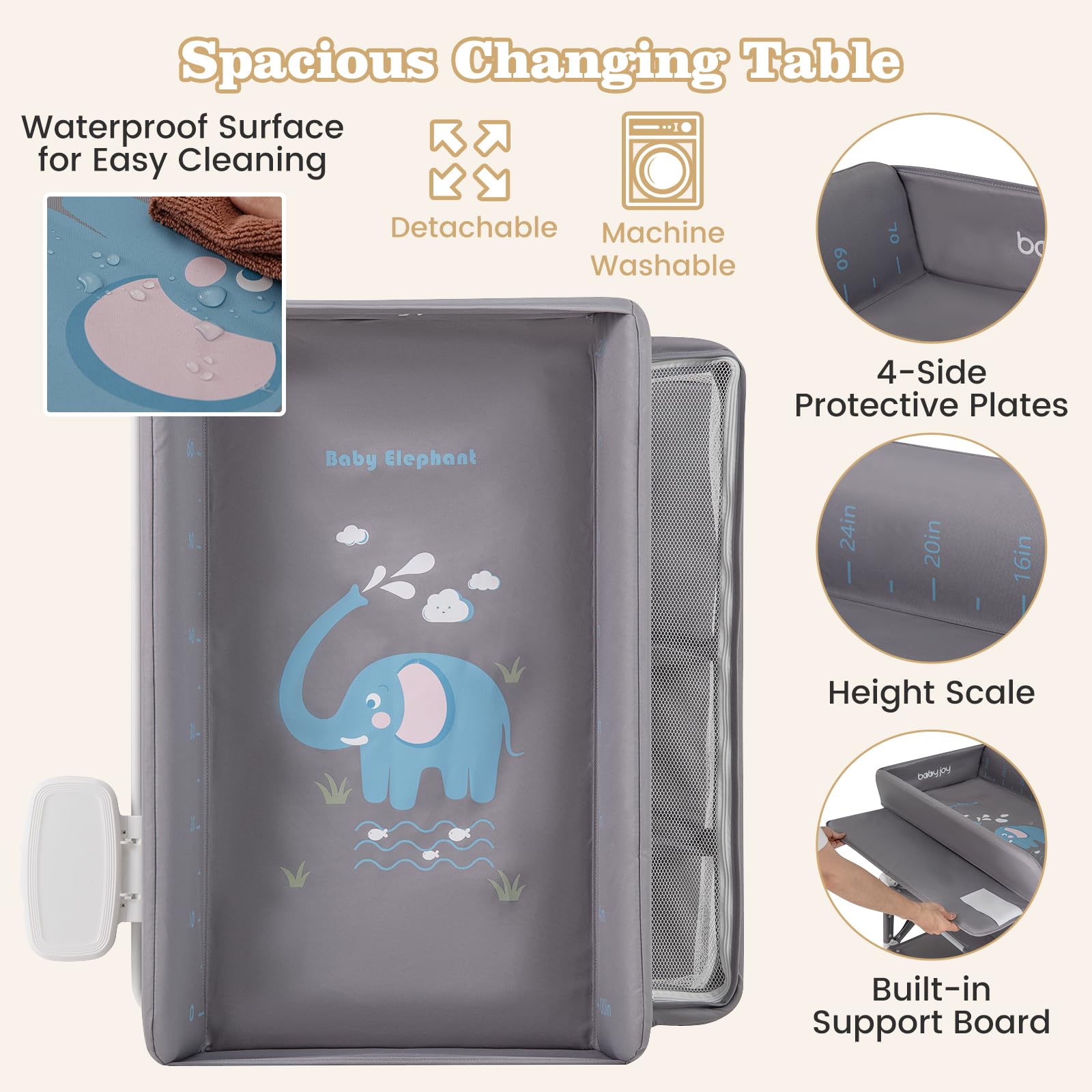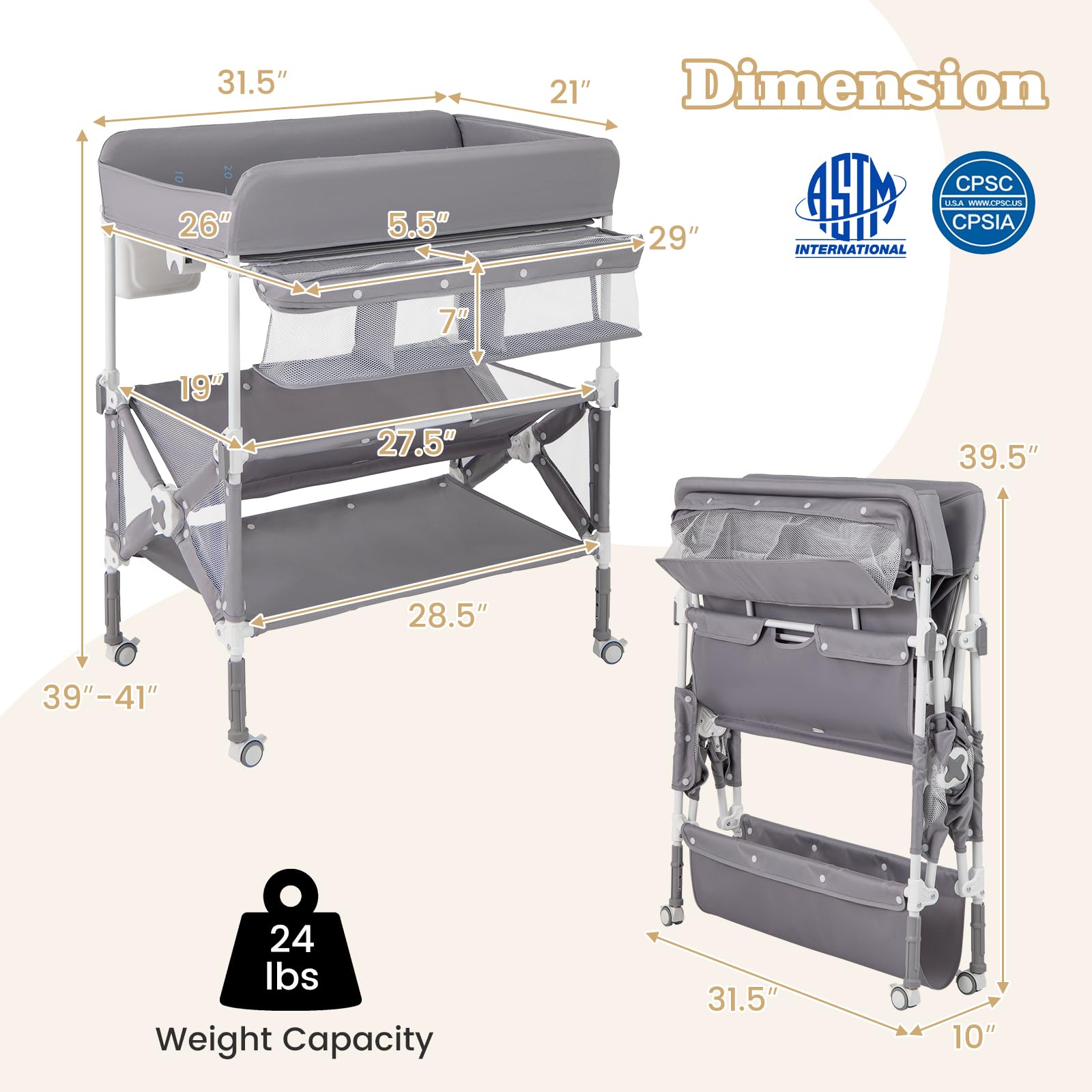 Adjustable Height,Water Basin | Storage Rack,Safety Belt,Fence | Wheels,Foldable,Storage Slots | Adjustable Height,Trash Can | Drawers,Safety Rails & Strap |