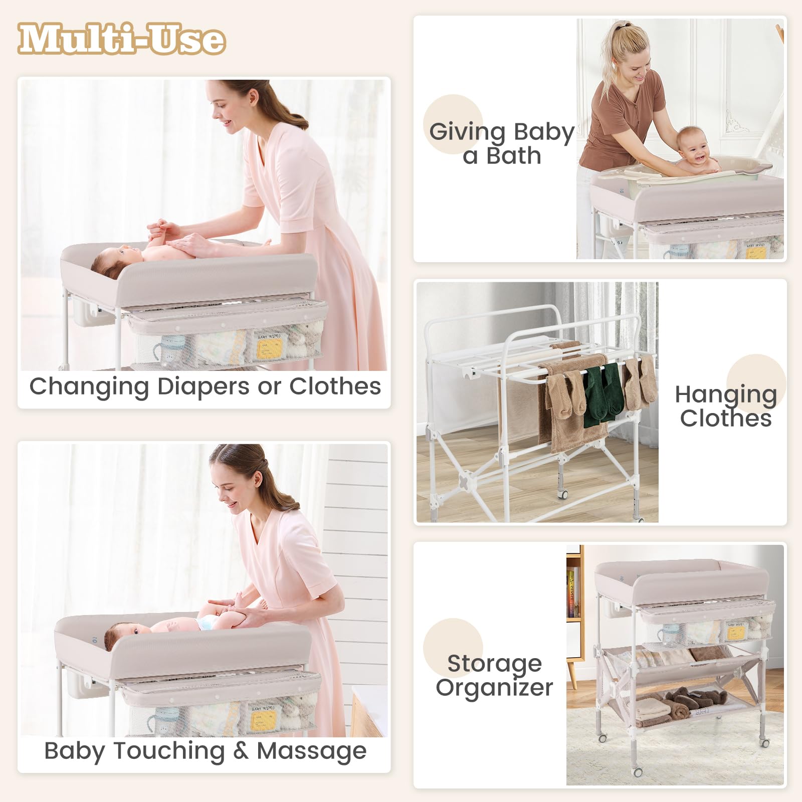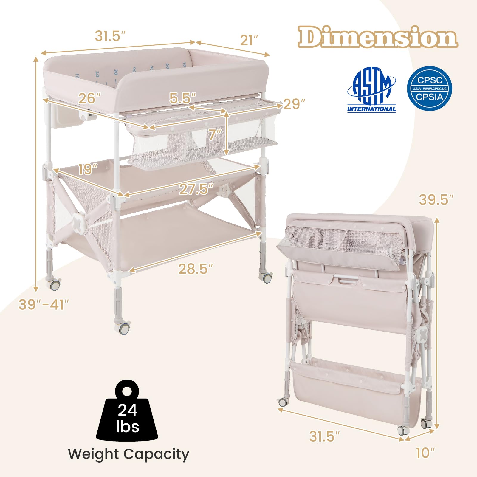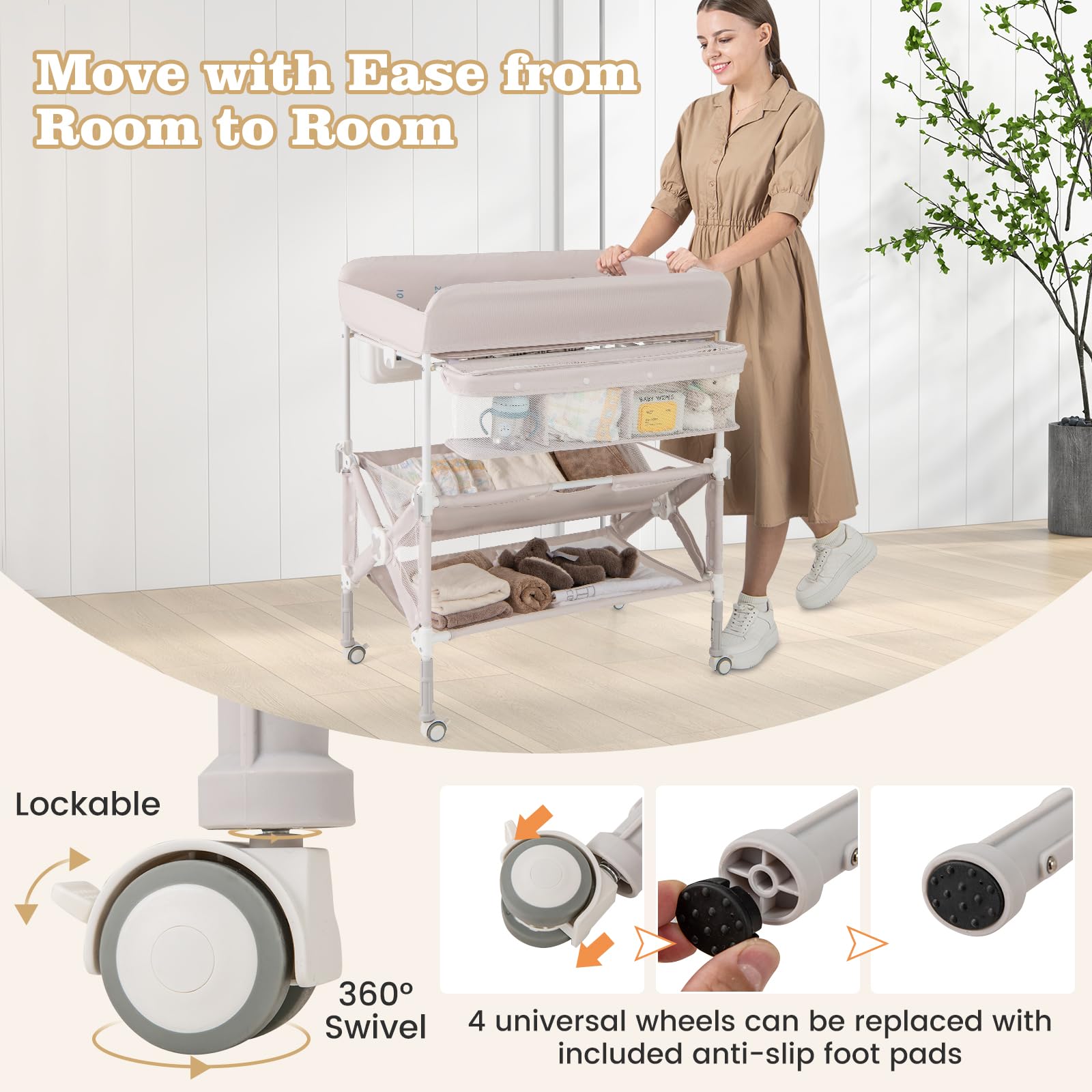 BABY JOY Portable Baby Changing Table, Foldable Waterproof Diaper Changing Station w/Wheels, Adjustable Height, Storage Basket, Shelves & Trash Bin, Mobile Nursery Organizer for Newborn Infant, Beige