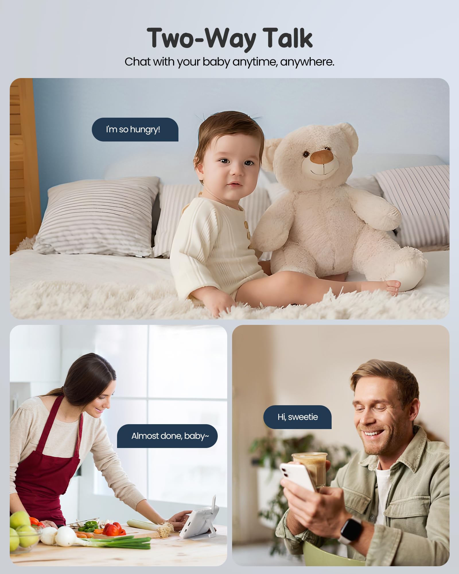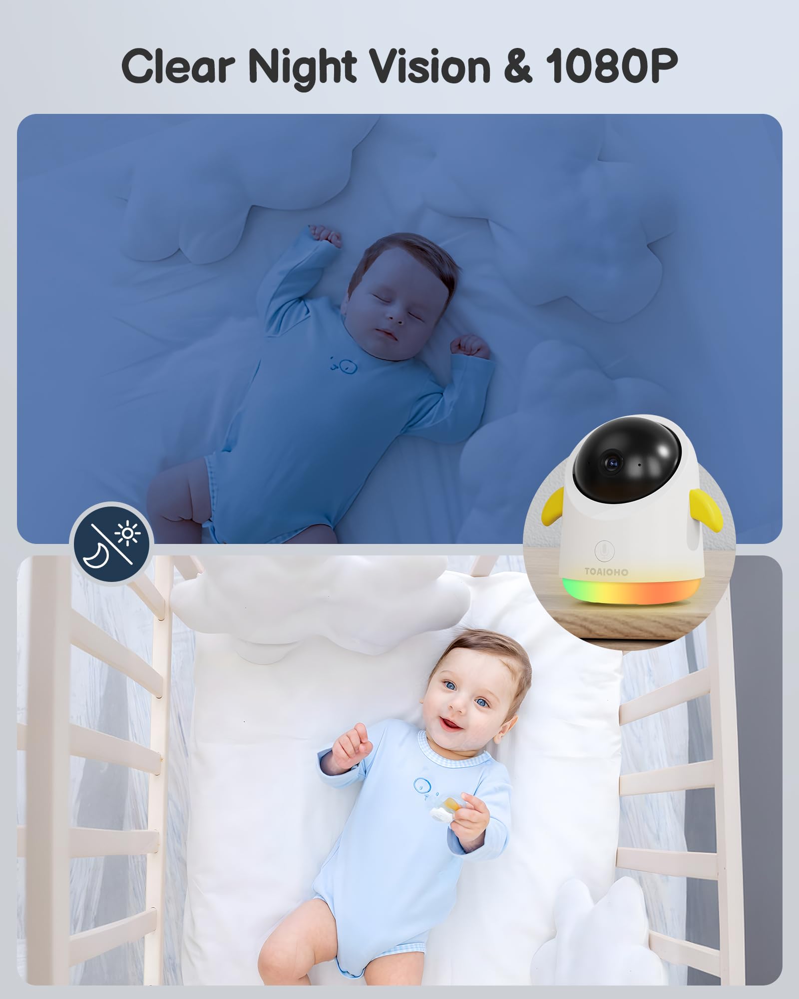 - Two-Way Talk, RGB Nightlights, Lullabies: The baby camera for room features colorful RGB night lights(various options), that creates a soothing light environment to help the baby fall asleep at night. The portable baby monitor can also play lullabies(various options) to soothe your baby. In addition, even if you and your baby are not together, you can use the baby monitor with camera and audio's two-way audio feature to lull your baby to sleep and read a bedtime story.