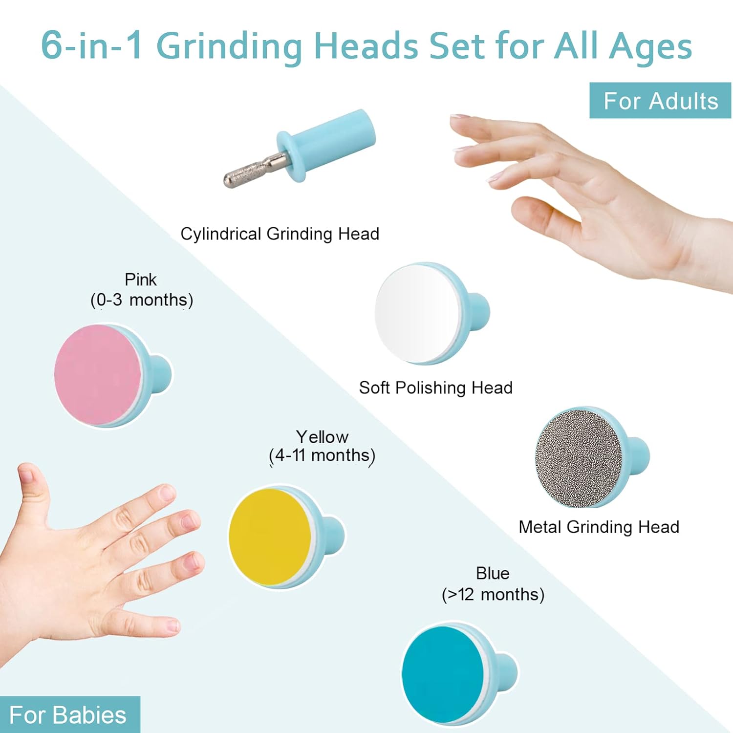 - [6-in-1 Manicure Set]: This baby nail clippers come with 6 different granding heads, 3 for baby and 3 for adults. You can choose the cuitable grooming heads for variable ages,available for newborn, baby and adults