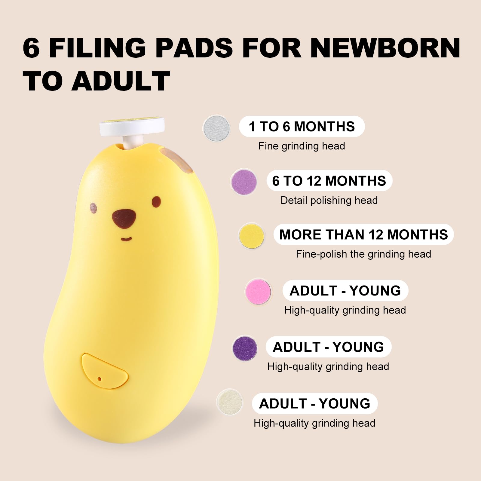 - Family Use - Our infant nail file comes with 3 replacement pads for baby, and 3 pads for adult grooming. It has 3 gear of grinding speed, suitable for newborn, 0-36 months Newborn babies, infant, toddler and also for adults of the whole family members