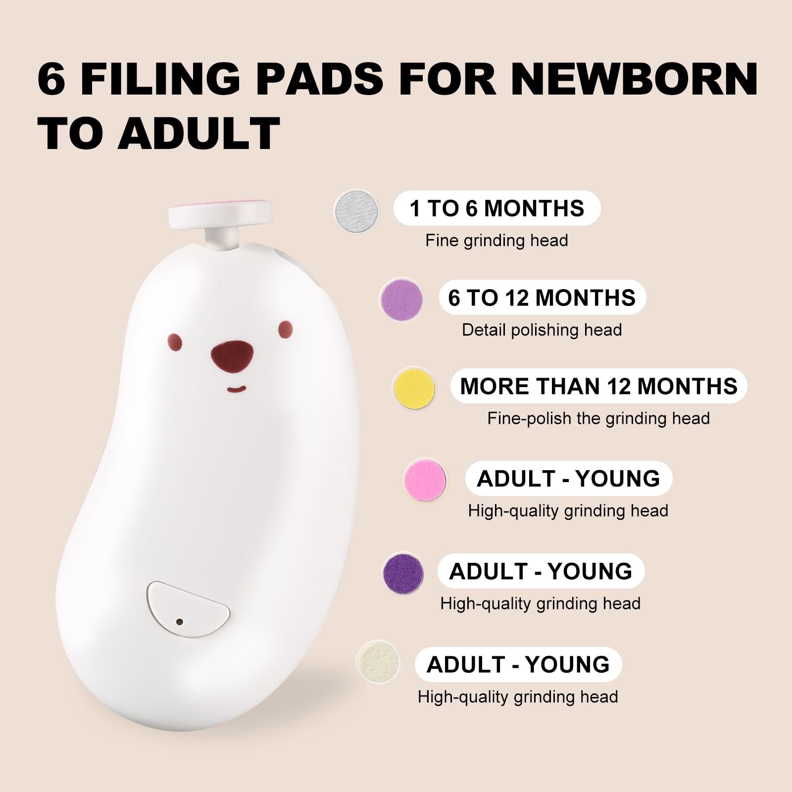 Baby Nail File Electric, Gentle Rechargeable Nail Trimmer, Baby Nail Clippers Grooming Kit Manicure Set for Infant Toddler or Adults, 6 Grinding Head Replacement Pads White