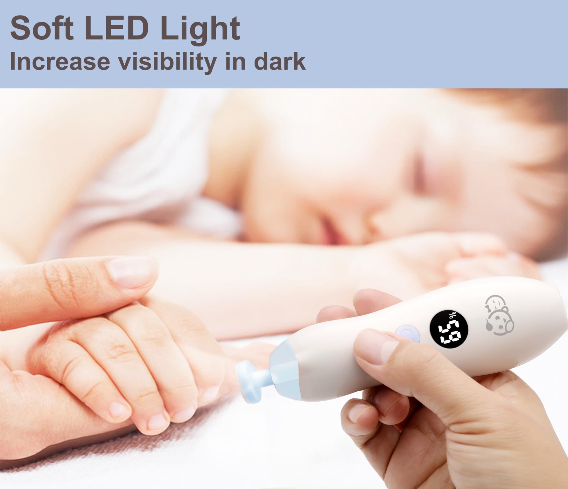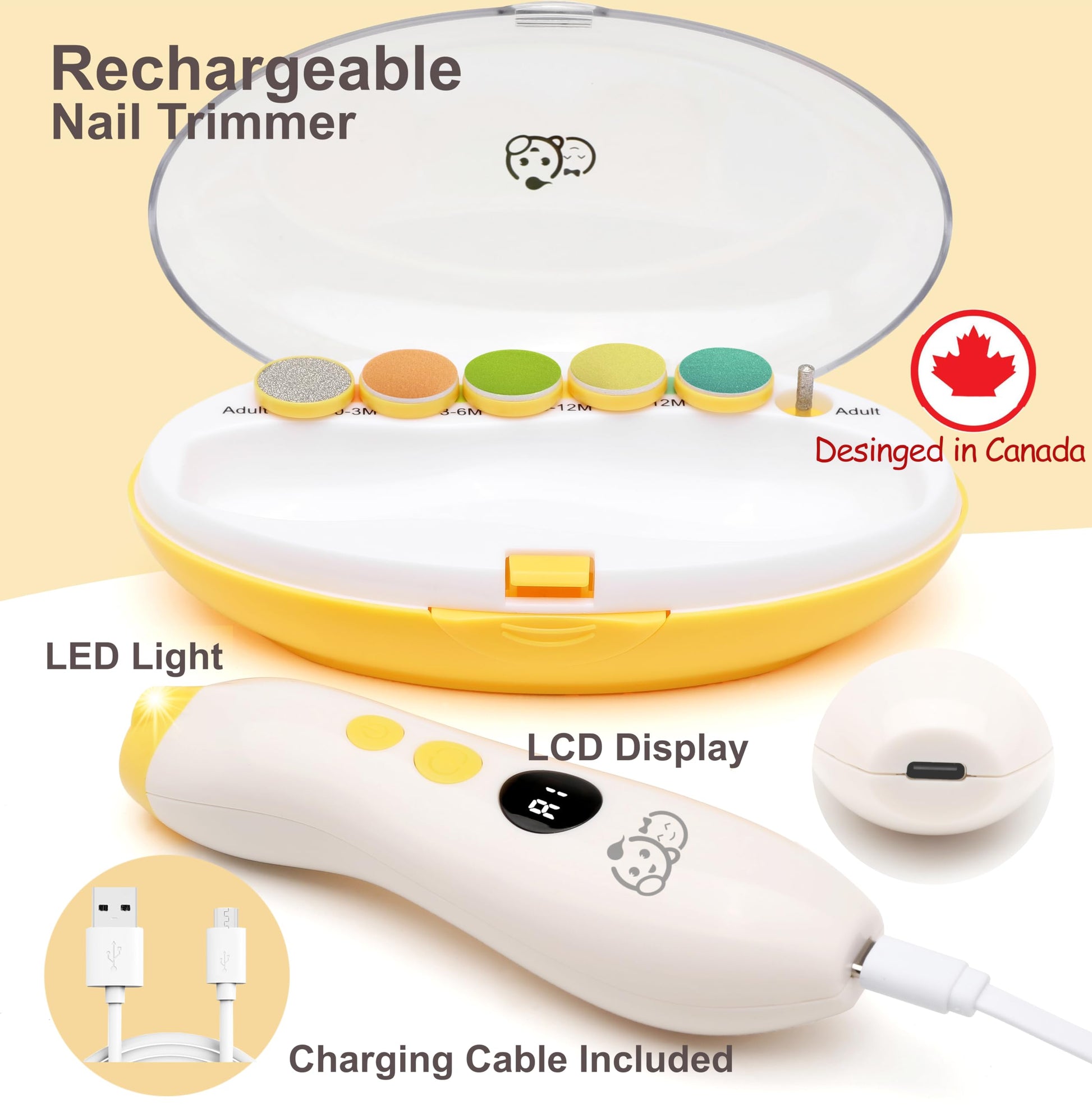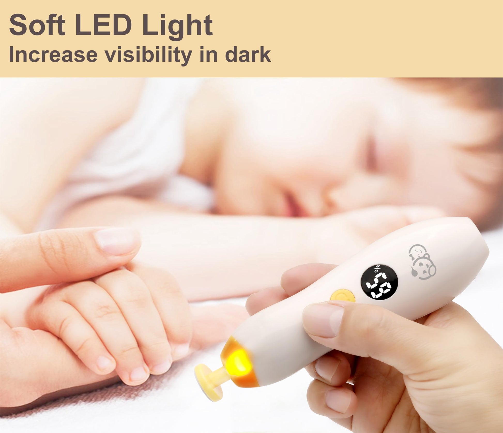 - [WHISPER QUIET & LED LIGHTED]: The nail file is powered by a powerful but WHISPER QUIET motor. With a soft LED light at top of the trimmer, you can grooming your baby’s nail even while they are asleep