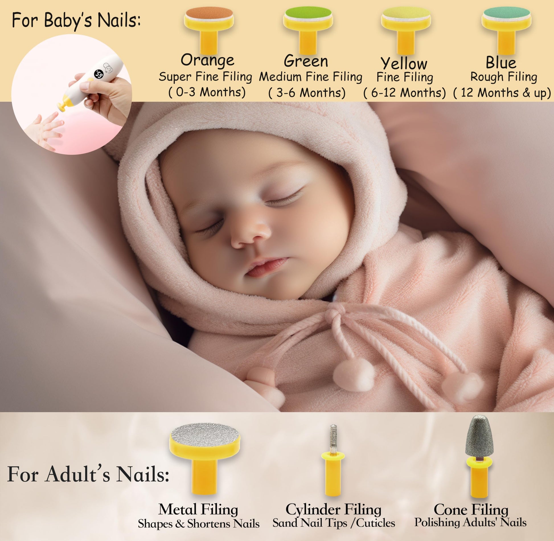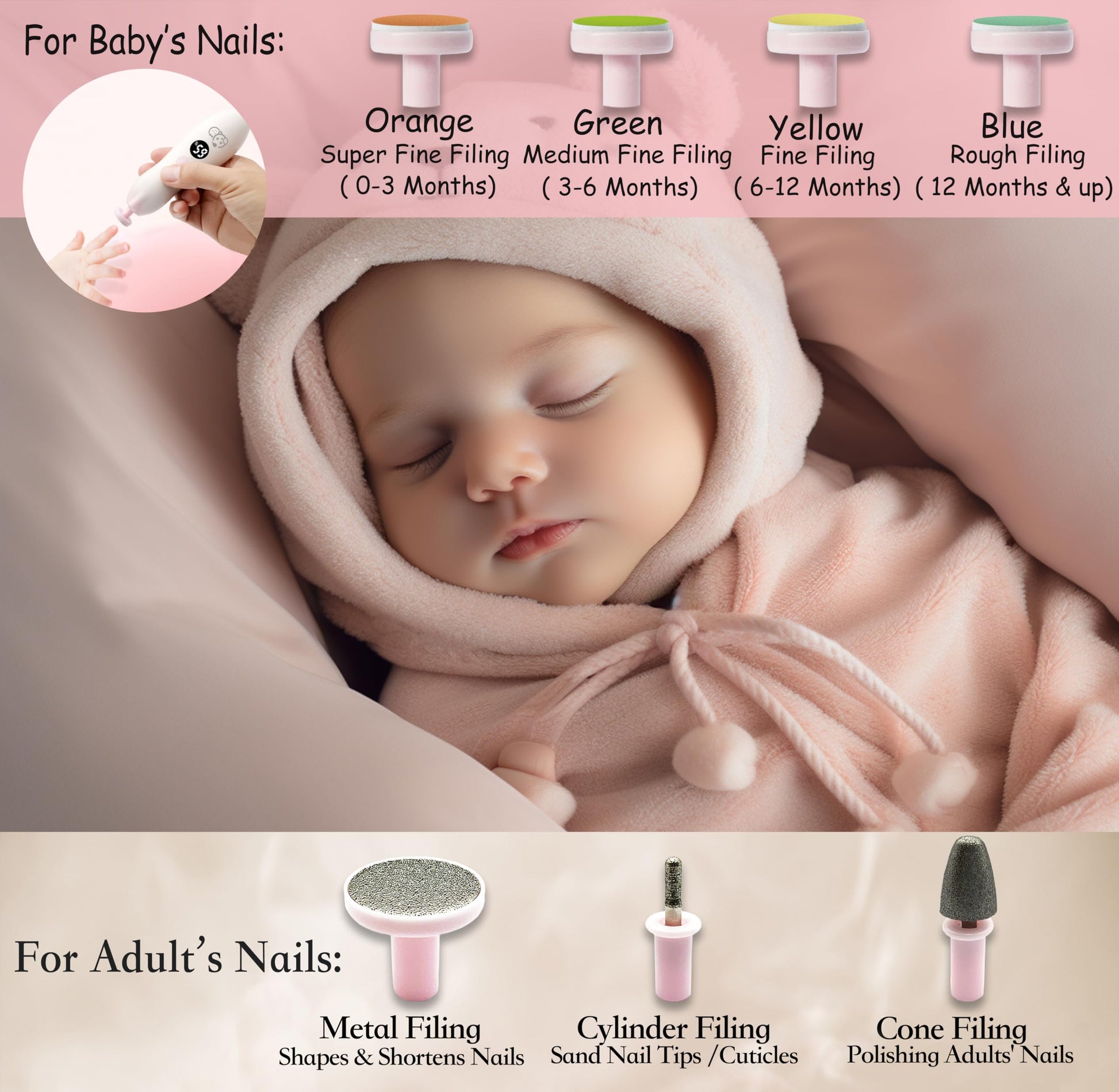 - [UPGRADED 21 in 1 VALUE SET]: 4 cushioned sandpaper attachment tools for baby's nails, and 2 for adult's nails. BONUS: 13 EXTRA replacement tools (12 for baby & 1 for adult). Save more from our value set. USAGE LABELED Organizing Case