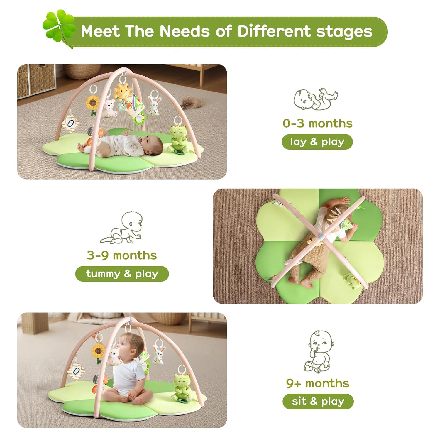 Baby Play Mat, Tummy Time Mat for Sensory Development, 4-Leaf Clover Baby Play Mat & Gym with 9 Detachable Toys, Portable & Easy to Clean, 0-9+ Months