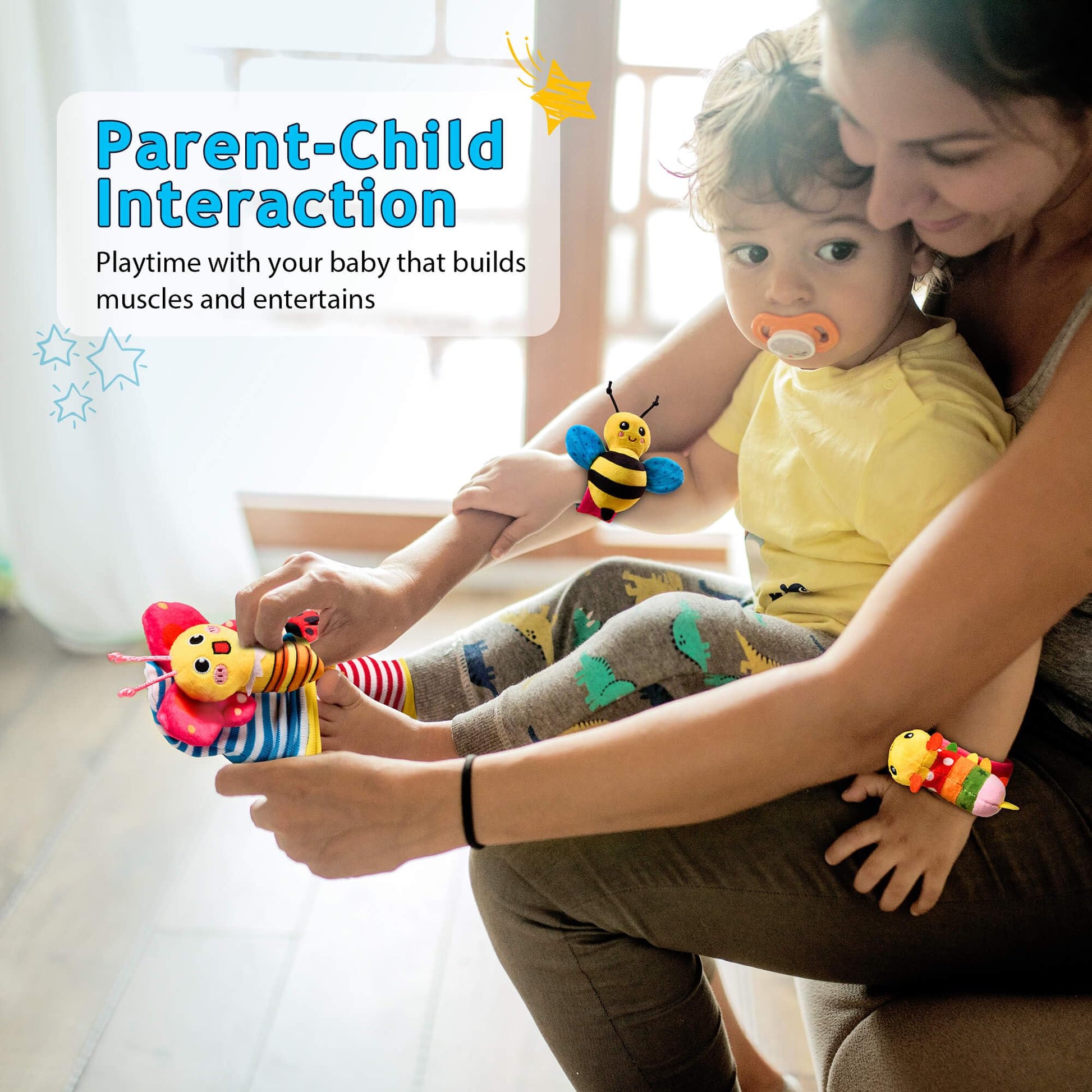 - đăCUTE DESIGNăAll Wrist Rattles and Foot finder socks have been upgraded, the sounds is larger than that of similar products. The wings of cute animals were with sound paper, with adorable bug attached to each wearable rattle, encourage baby to reach and grab. These baby toys are sure to keep them entertained for hours on end.
