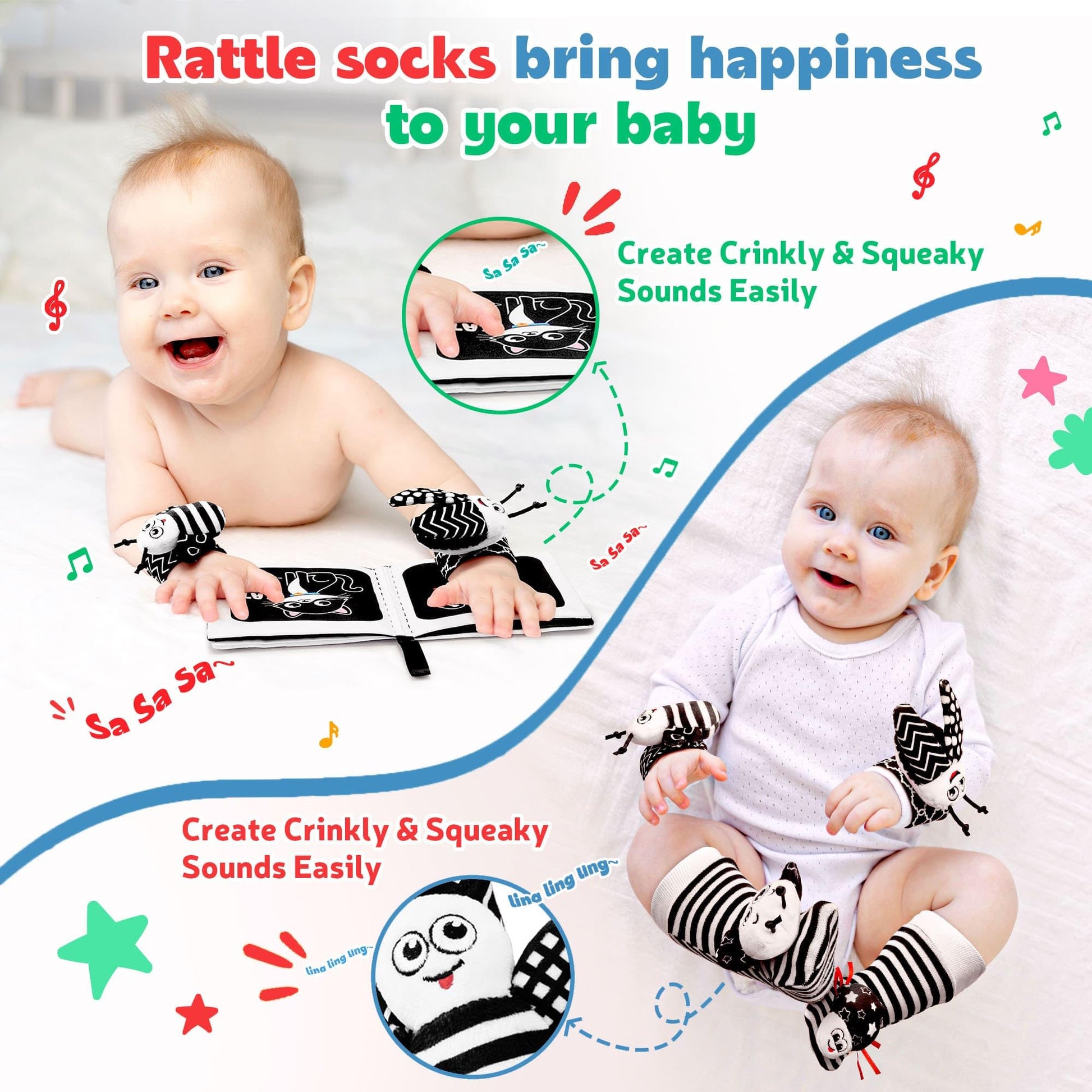 - â¨ăPROMOTE SENSORY EXPLORATIONăThese bright colorful rattle socks will entice little baby to touch, grab and look at them. baby will be encouraged to grab and reach the bright colorful wrist rattles and foot finders. Strengthening Color Cognition/Vision Cognition/Hearing Development & Voice Development and help 0-12 months babies improve their cognitive skills.