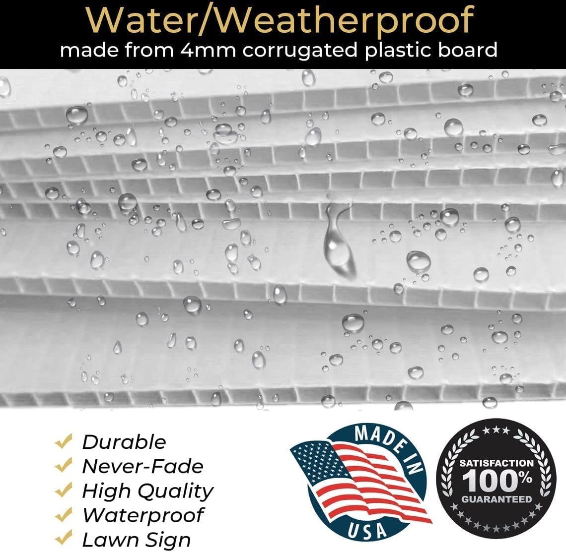 - Each yard sign comes in 4 sizes for your choice, 12''W x 18''L, 18''W x 24''L, 18''W x 27''L, or 24''W x 36''L. It is printed at high resolution and is weather-resistant with high-quality ink to stay strong in all conditions.