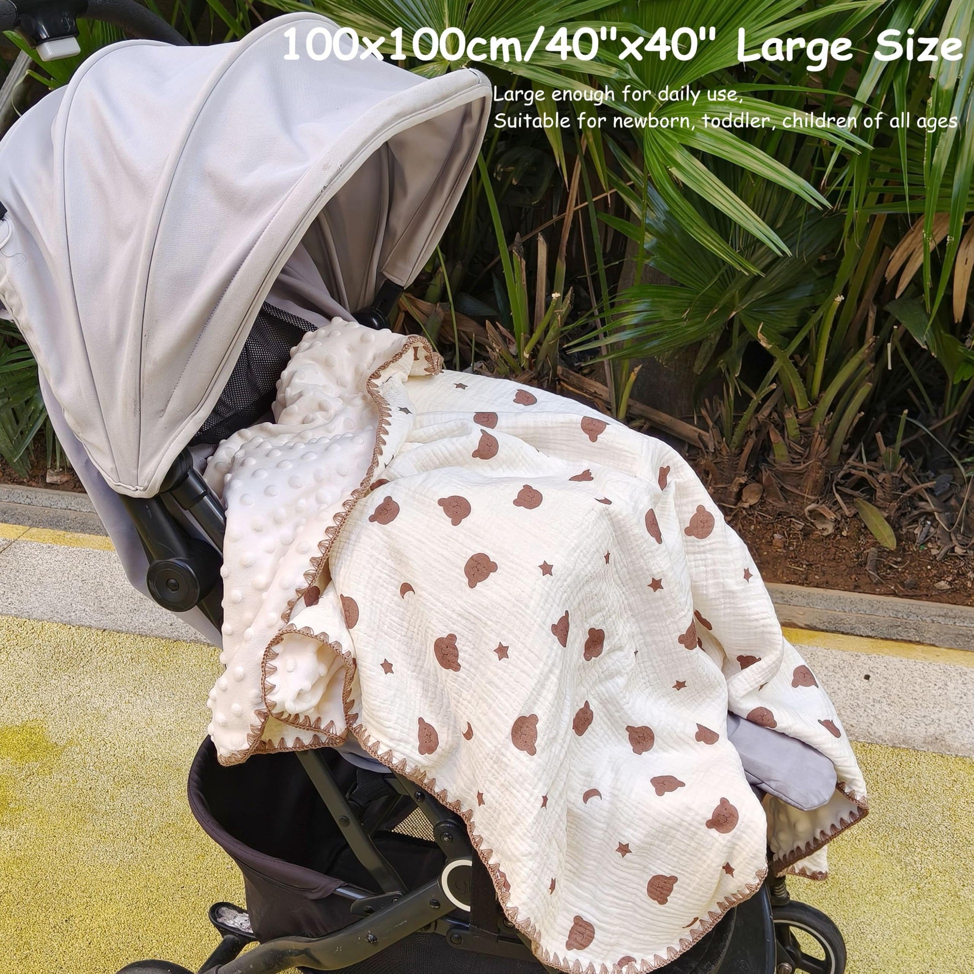 Our blankets are designed in double layers, measuring 40x40 inches, it can accompany your baby from newborn to toddler. You can also use it as stroller cover, game mat, crib blanket, nap blanket, swaddle blanket etc.