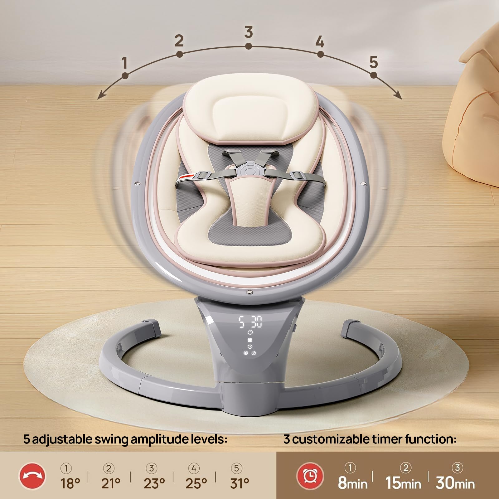 - [🎉Scientific Design]: The baby swings for infants offer 5 natural swing speeds. Freely adjust the speeds to create a comfortable feeling of mother's arms. You can set 3 different gear times: 8, 15, or 30 minutes. Parents can set their baby's soothing time in advance with ease