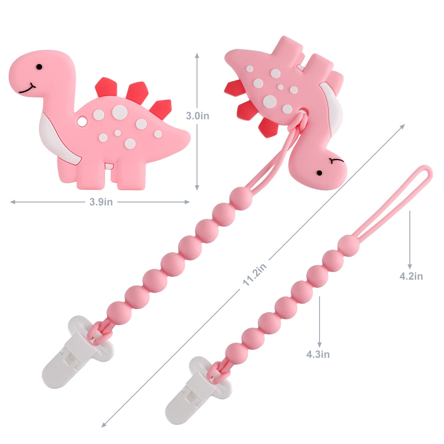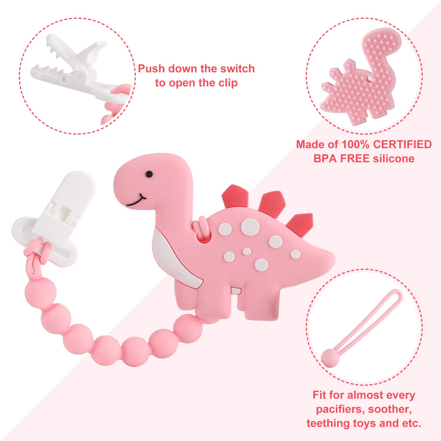 Baby Teething Toys for Babies 3-6 6-12 Months, Dinosaur Teether Pain Relief Toy with One Piece Design Pacifier Clip Holder Set, Freezer Safe Neutral Shower Gift for Boys and Girls (Pink)