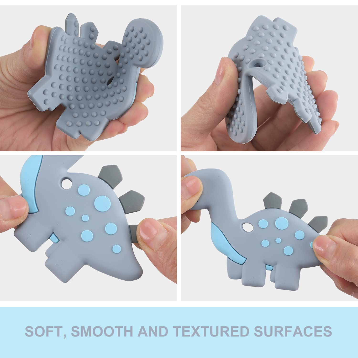 - No more gum pain: Calm your baby’s gum discomfort and soreness with our teething toys that are specially designed to massage and soothe the gum. Your infant can ideally grab it due to its non-slip texture and features super practical and cute dinosaur design.