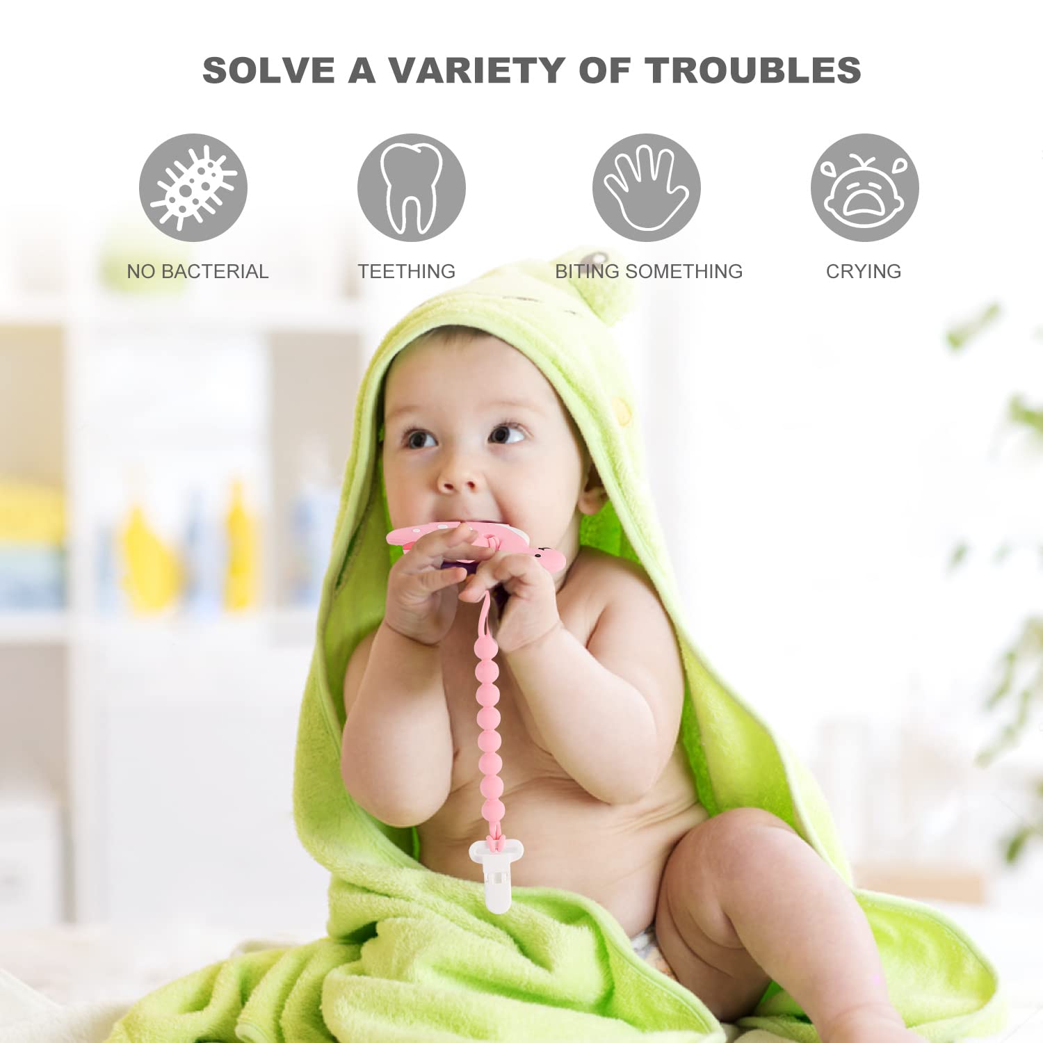 - Made to last: Our pacifier clip and teether bundle are made of food-grade silicone, a material that stands out with its durability and resilience. The safety clip of the pacifier is made of plastic; no need to worry about rusting.