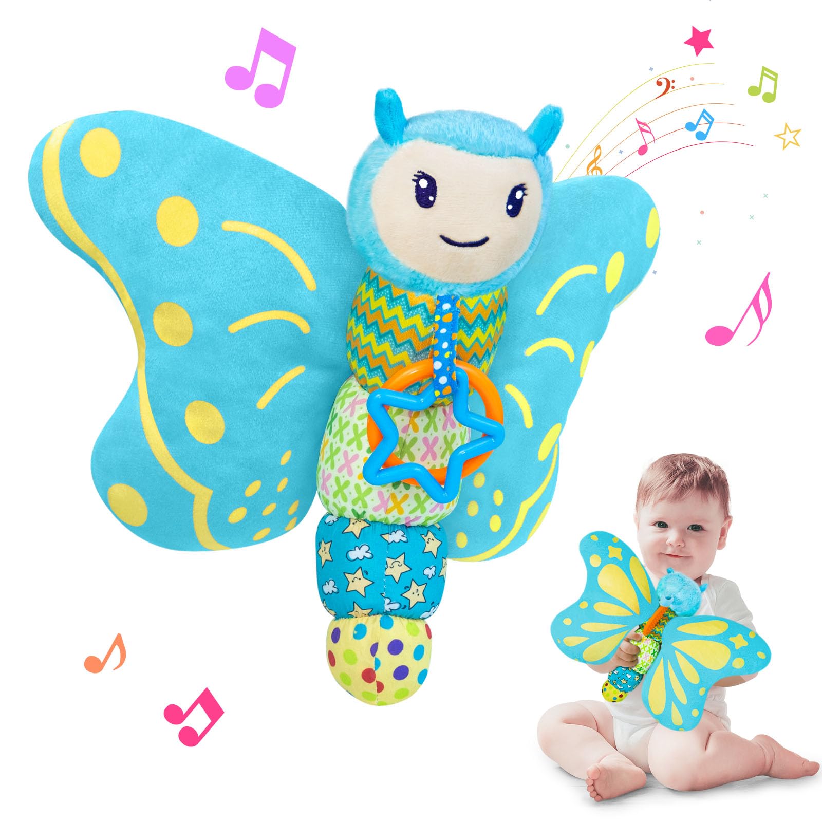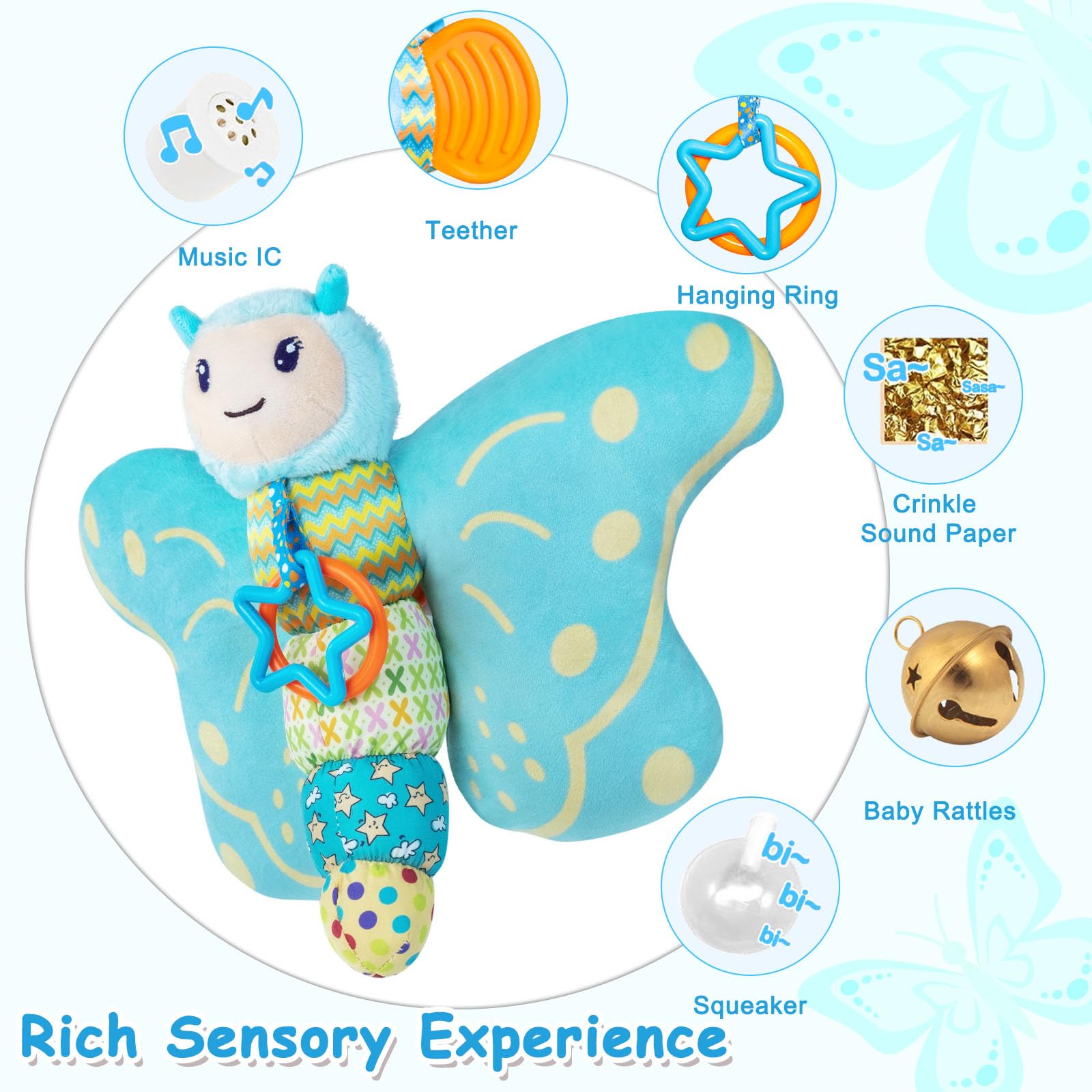 Baby Toys 0-6 Months,Infant Musical Sensory Stuffed Animal with Squeaker,Rattle,Crinkle Wings,Teether & Hanging Ring,Tummy Time Toy for Newborn 0-3-6-12 Months Boys & Girls Gift,Butterfly,Blue
