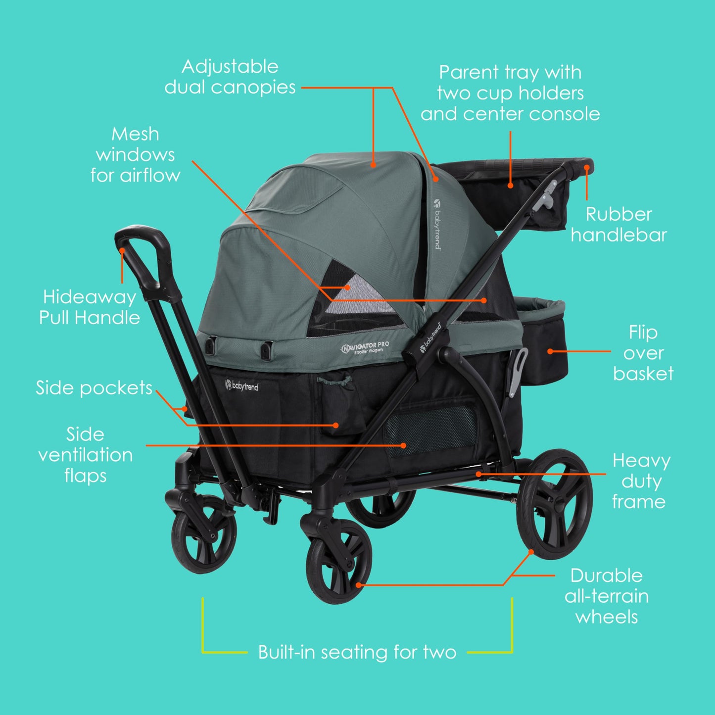 - Hideaway Pull Handle easily allows the Tour to transform from a push stroller to pull a wagon mode
