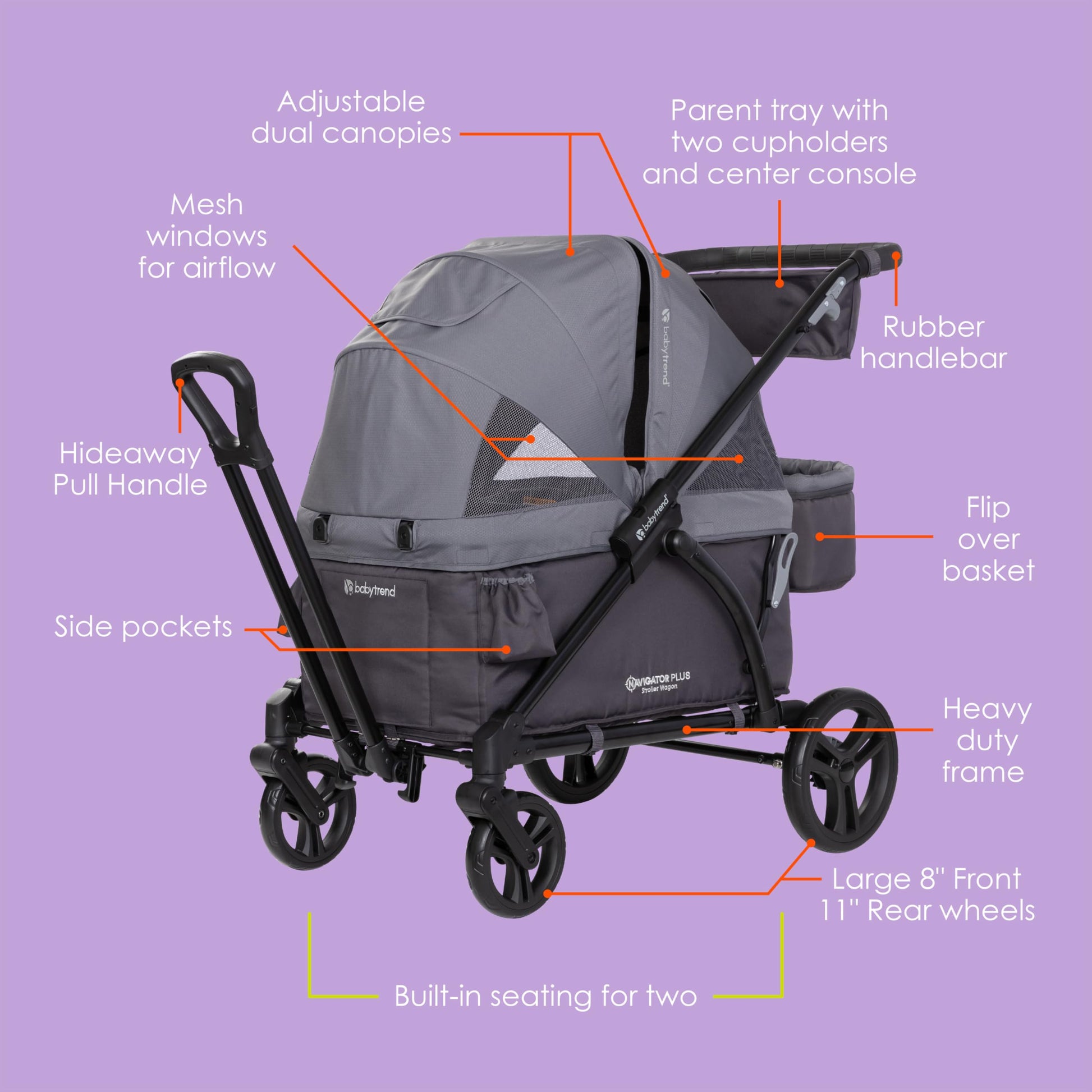 - Ultimate Storage Solutions: includes parent and child trays with 2 cup holders and center consoles, plus 2 additional cup holders outside of the wagon