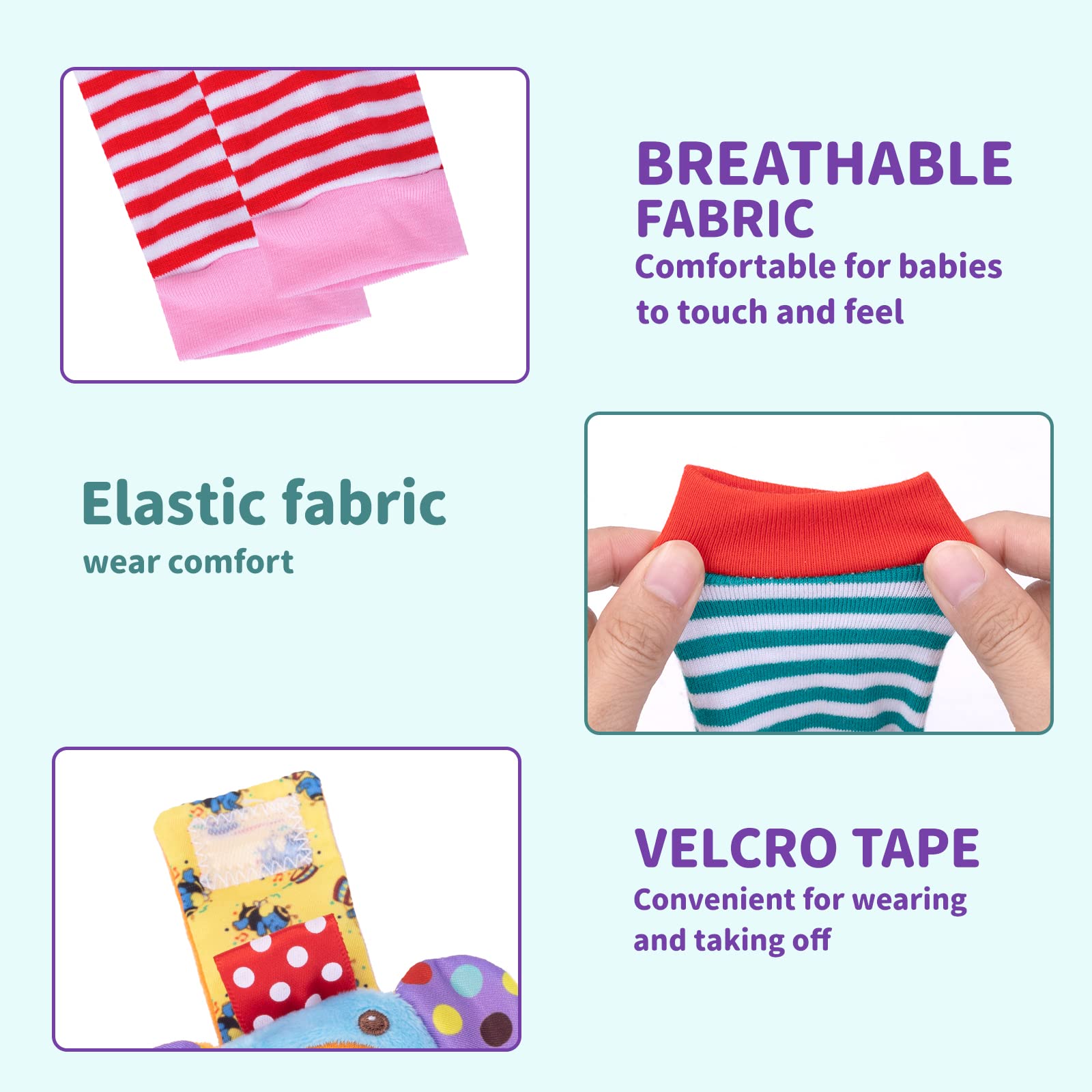 - Early Education- All Wrist Rattles and Foot Finder Socks have Bells Inside and The Wings of Bee were with Sound Paper, Bright Colors and Pleasant Rattle Noise, will Stimulate Baby Vision and Hearing, Good for Boys and Girls Starting to Focus on Things and Sounds, Colorful Wrist Rattle Socks will Promote Baby Sensory Exploration Through Touch and Sound, Help Baby's Develop Hand, Foot and Eye co-ordination, Strengthening Color Cognition/Vision Cognition/Hearing Development & Voice Development.