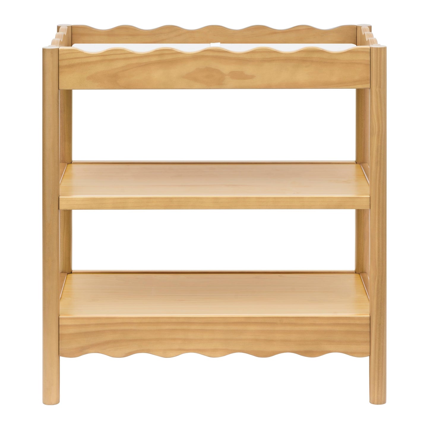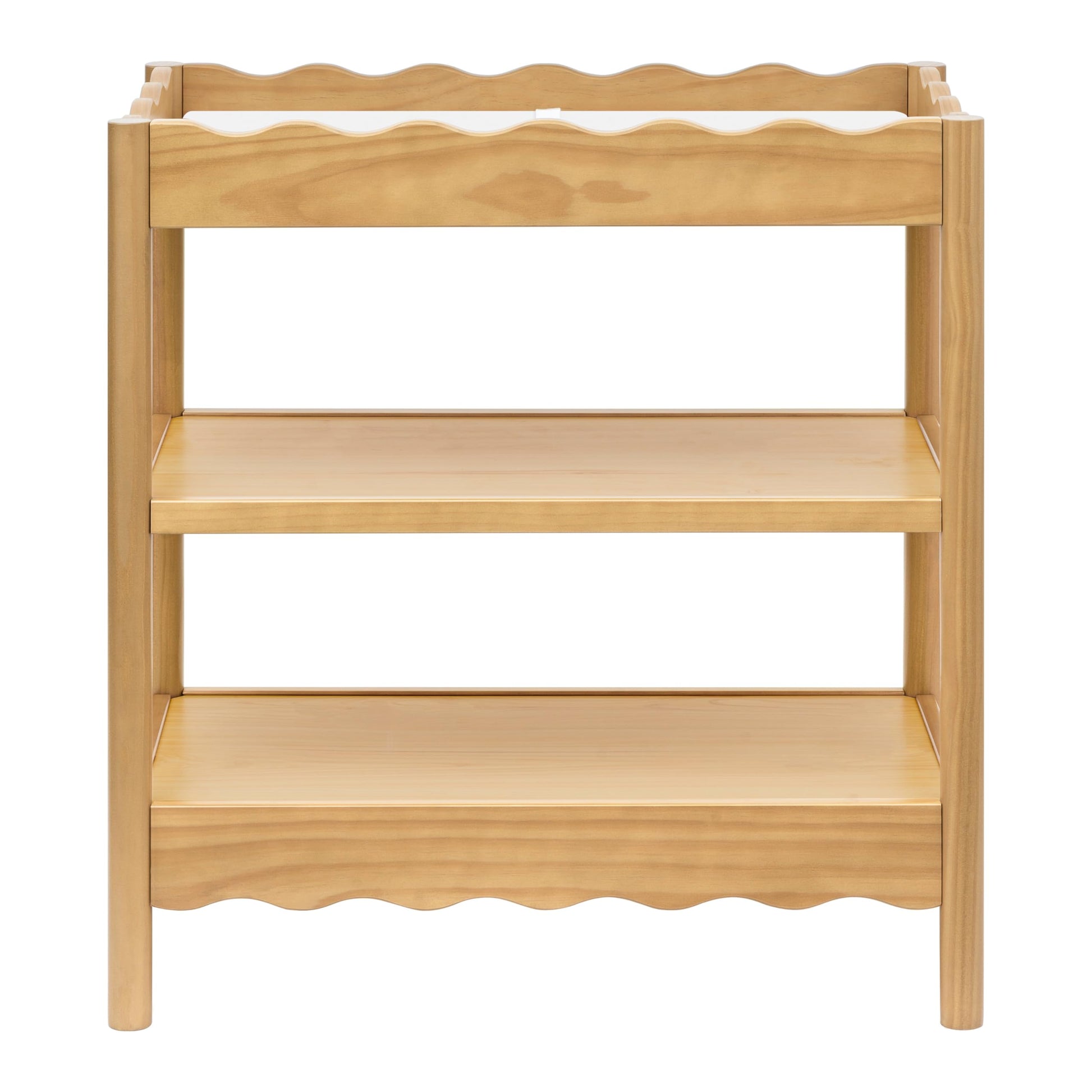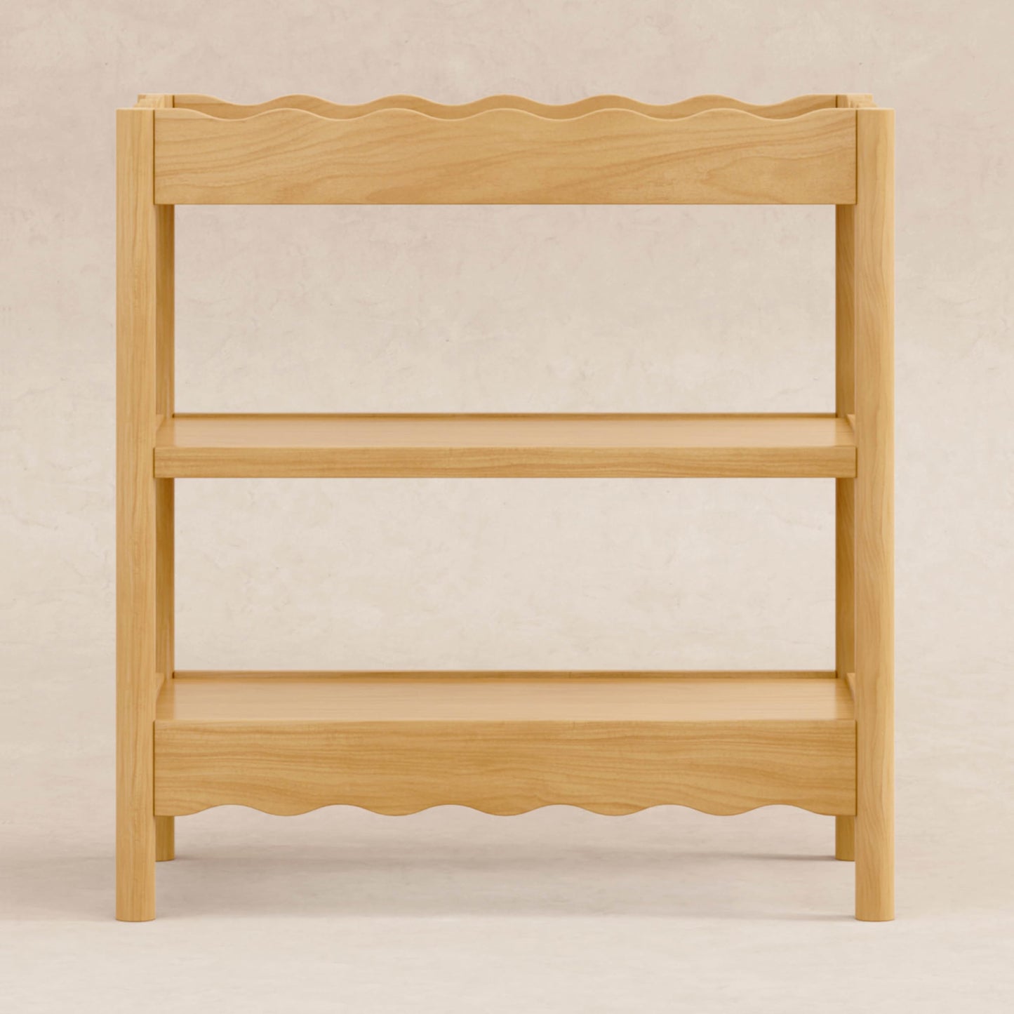 With rounded posts and wave-like edges, the Swell Changing Table has a modern, ocean-inspired design that pairs perfectly with your Swell Crib. It features two spacious, open shelves for all your diaper changing needs for convenient changings.