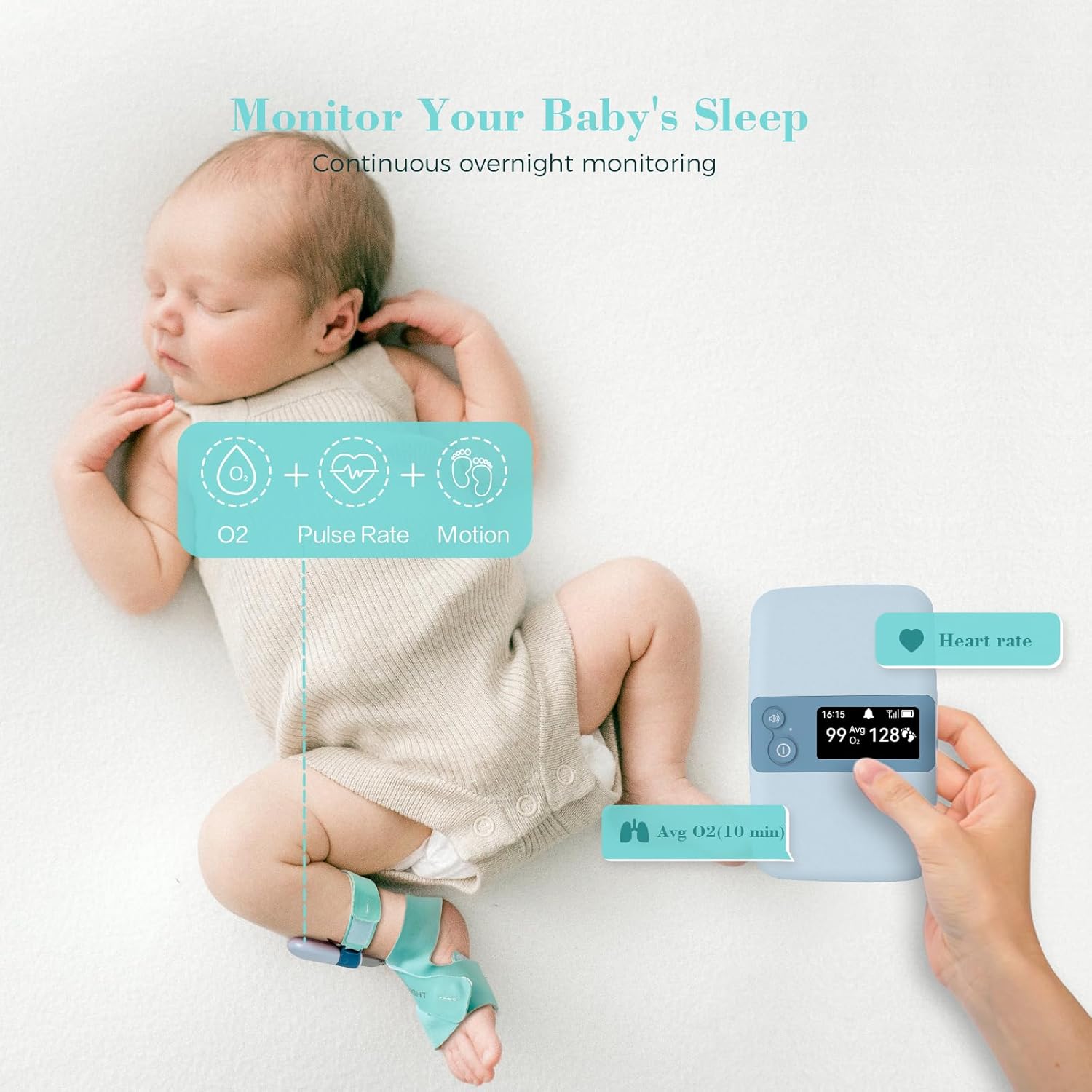 - 【Monitor baby’s sleep with notification】Track, record and store baby's sleeping statistics, including heart rate, movement and average oxygen level, from which you can judge baby's sleep quality. Your smartphone, monitor and base station will receive real-time notifications if any irregularities are detected