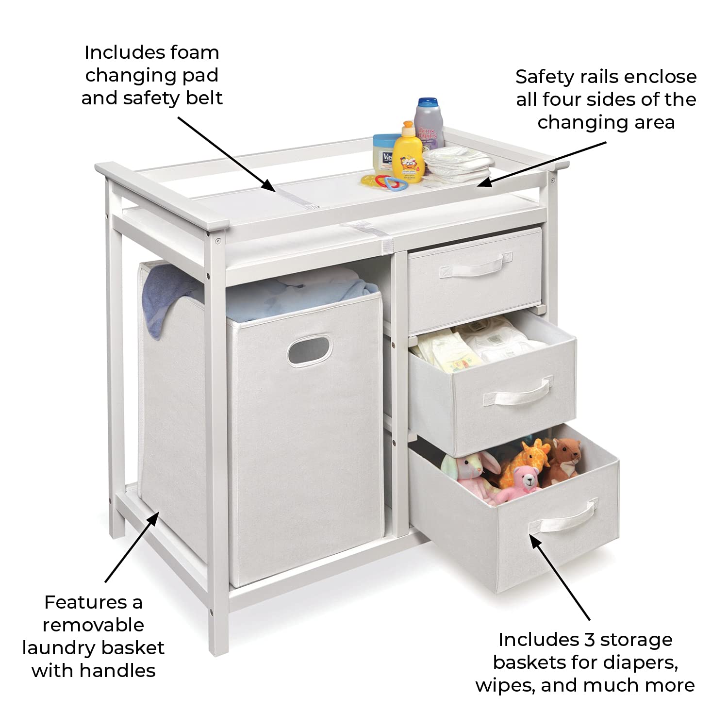 Badger Basket Modern Baby Changing Table - Portable Diaper Station with 3 Drawers Pad & Hamper - Storage Organizer for Baby Clothes, Diapers & Toys - Fresh White/White (34.25 x 20.75 x 34.5)