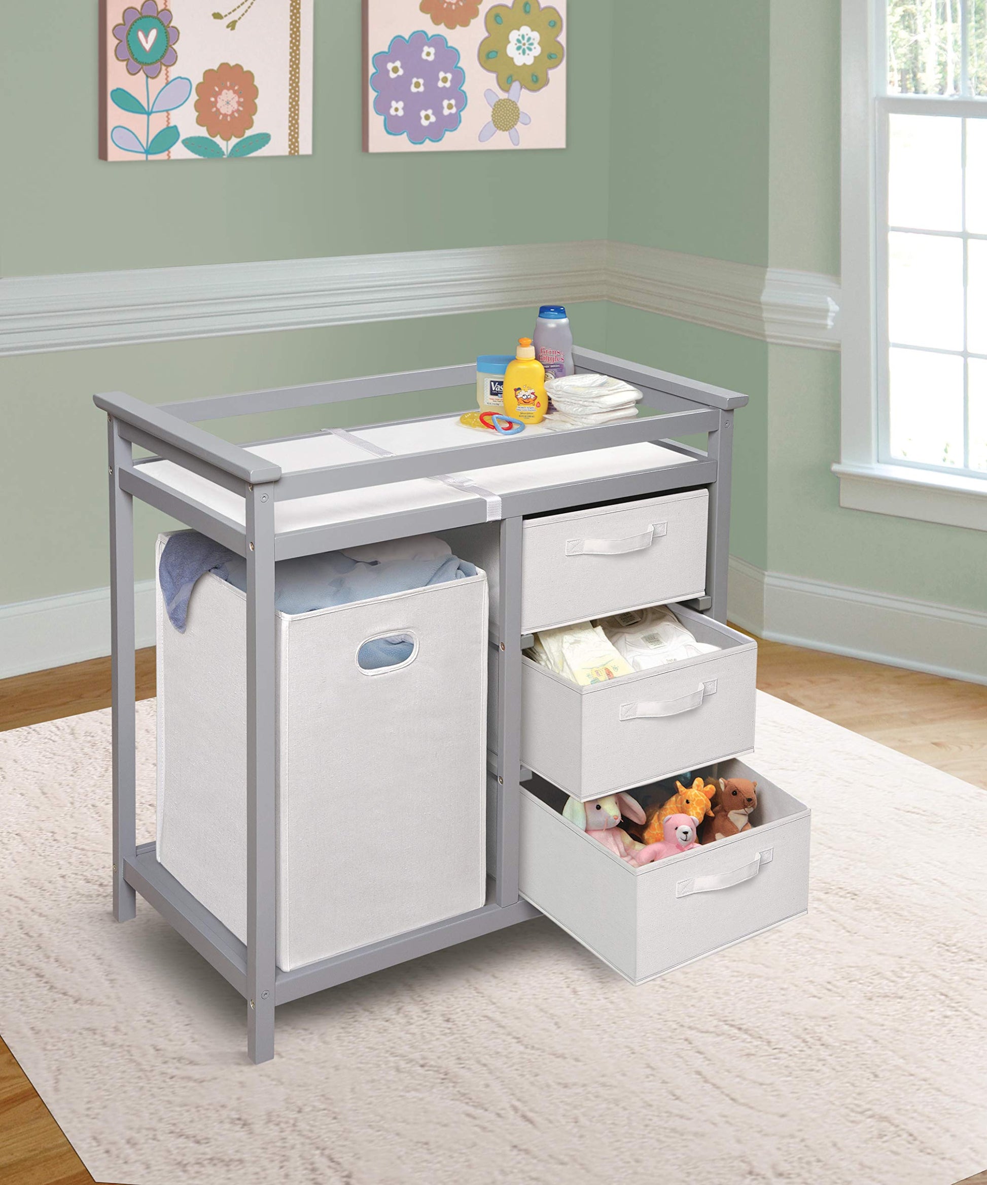 - CUSTOMIZABLE AND PORTABLE STORAGE OPTIONS - Features removable, collapsible baskets and a hamper that can be relocated, folded flat for storage, or swapped out for a Diaper Genie.