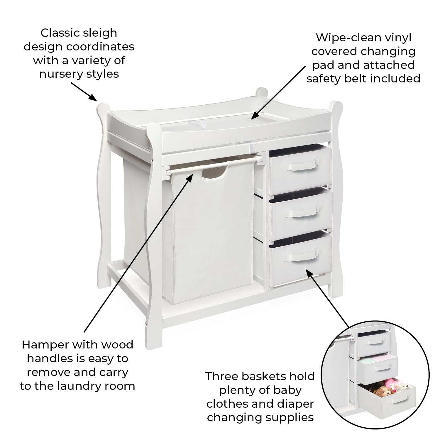 Badger Basket's smart Sleigh Style Baby Changing Table with Hamper and 3 Baskets is an all-in-one station for changing and dressing your baby and keeping dirty clothes out of sight. Removable drawers and hamper so you can see everything inside and easily tote Baby's soiled duds to the laundry room.