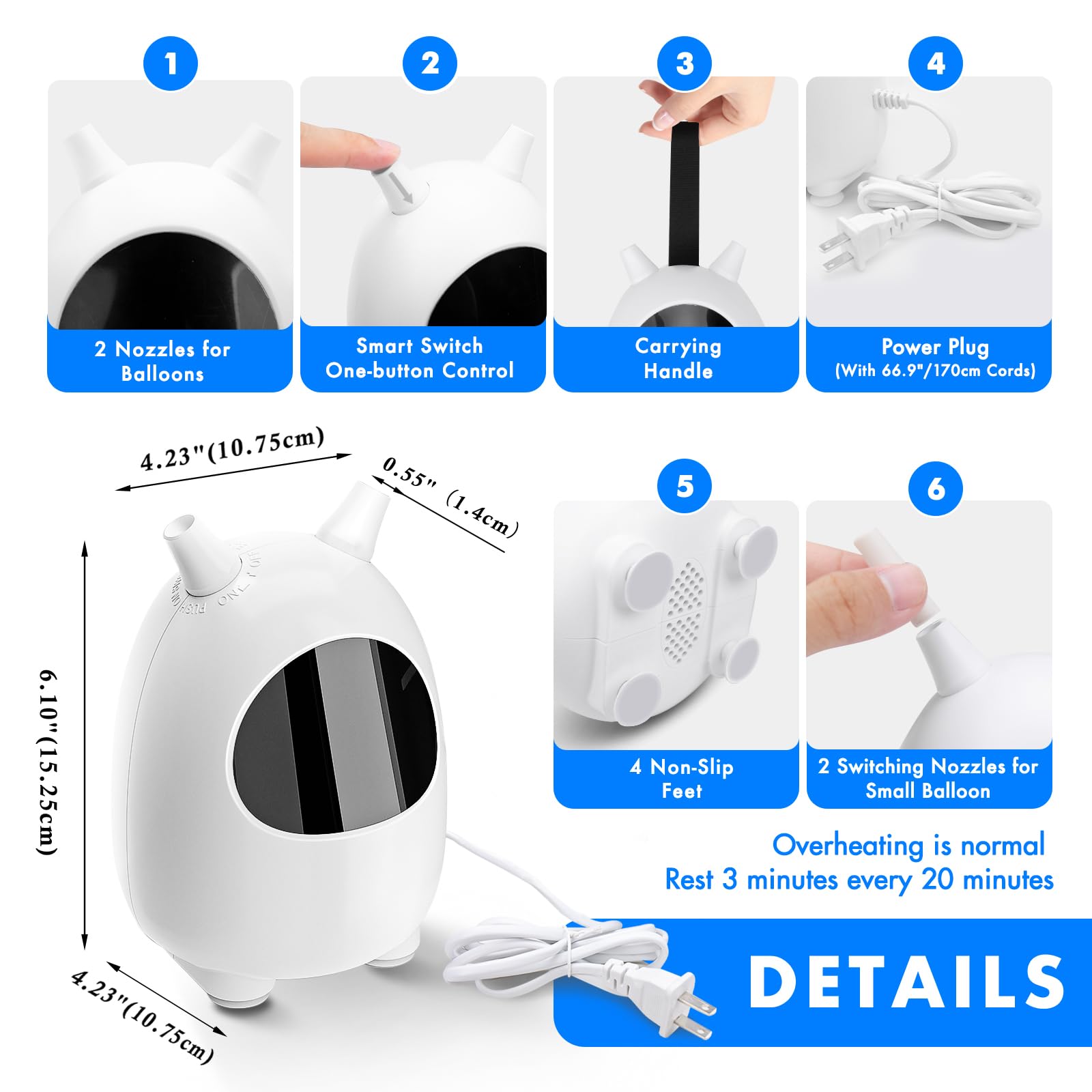 2 Nozzle Sizes:With 2 nozzle sizes to inflate different sized balloons. You can add the small nozzle if you want blow small balloons.