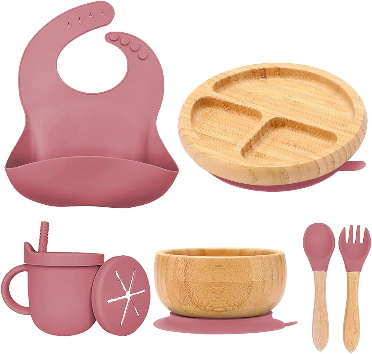 - Powerful noLearn Self-Feeding Skills: The spoons included in the bamboo baby feeding set are designed for small hands, making it easy for your little one to learn self-feeding skills.n slip suction base sticks to the high-chair or kiddie table to prevent spills & mess.